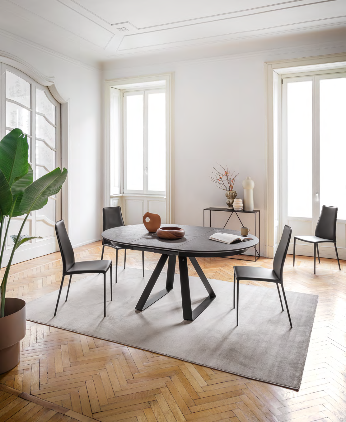 The 4 thin but sturdy metal legs are painted in the same finish as the seat, a detail of great aesthetic value.