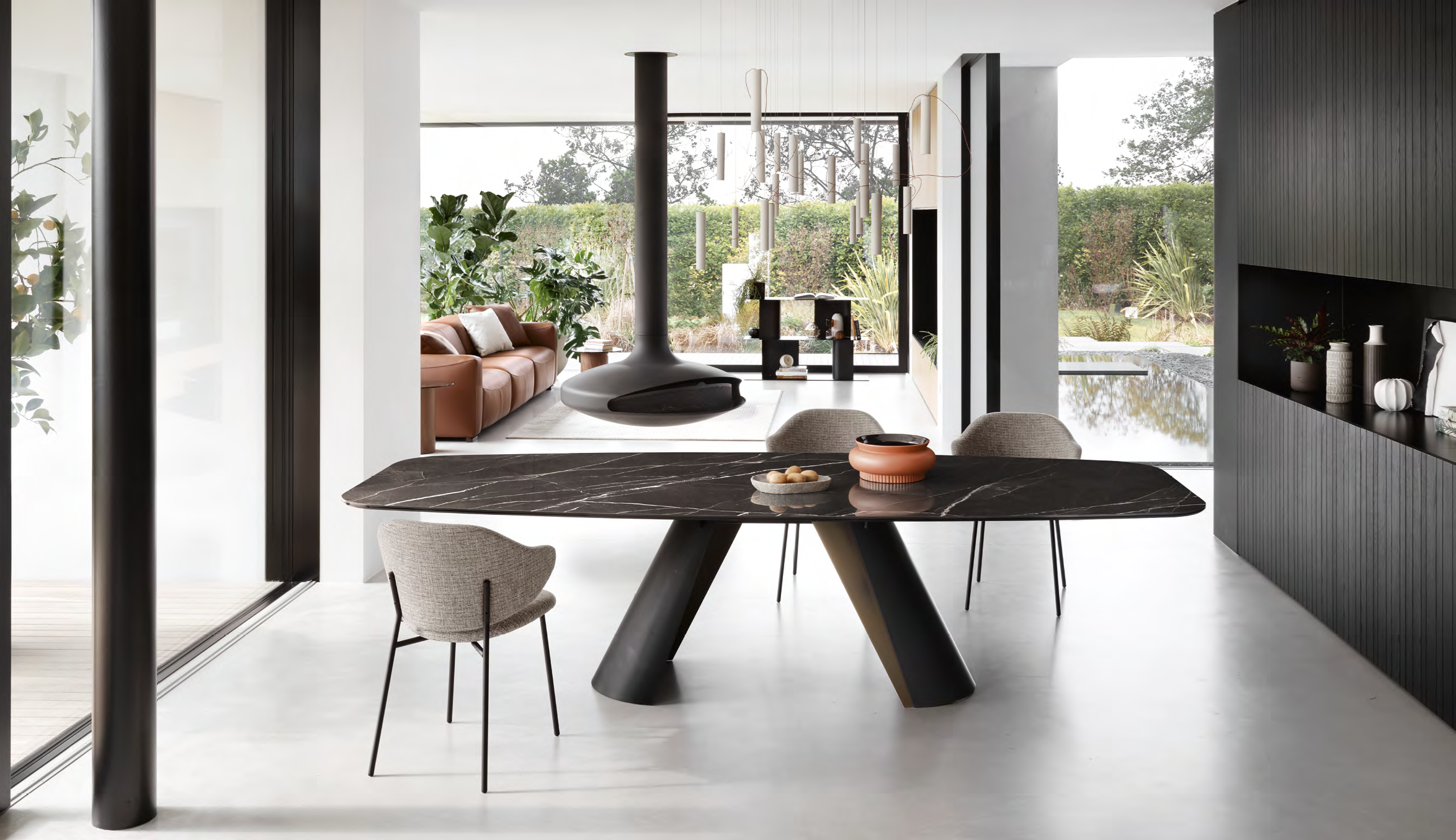 APIAN CS4132-FB Table by Calligaris. Apian is a table with a majestic yet light appearance. The thin ceramic top rests on a double sheet metal, curved and inclined, which forms its base. The coupling of two metal sheets of different colors creates a particular two-tone effect, which in the black version gives life to a play of light and shadow, in the white version to a graphic suggestion.