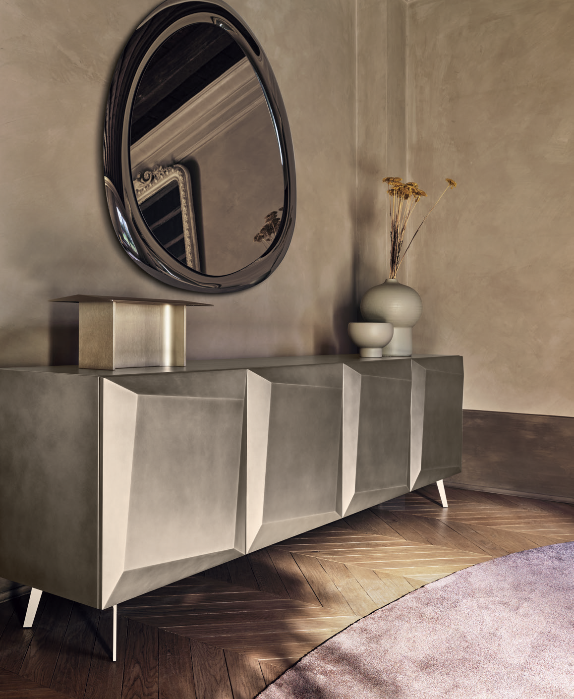 Alterego features a sophisticated volume that gives the door a three-dimensional, almost sculptural feel. A bold aesthetic solution for a sideboard designed to be a key feature of the contemporary living room.