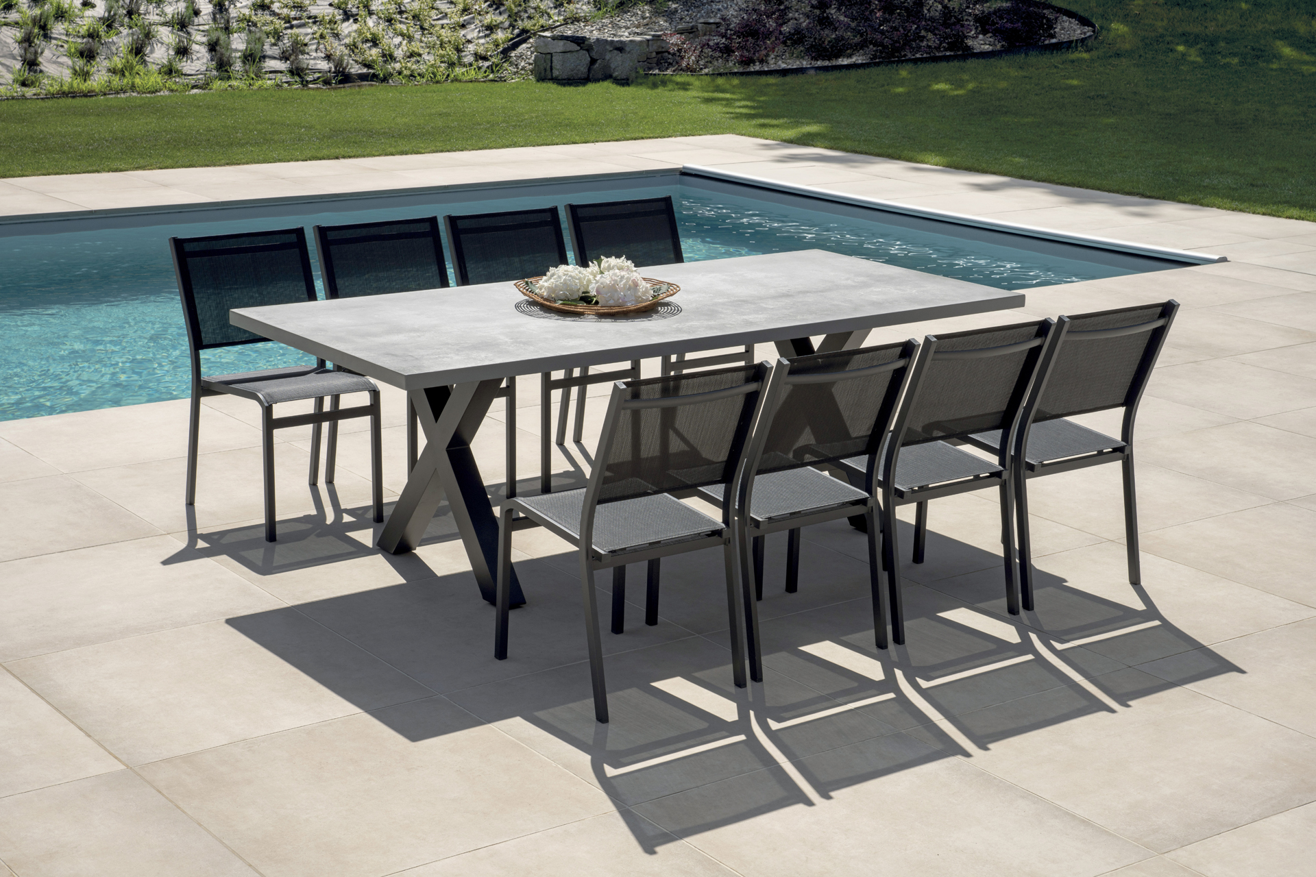 The Amantea 220x100x75 table is designed to offer space, durability, and a contemporary style for outdoor settings. Thanks to its anthracite aluminum frame, the table ensures stability and lightness, making it weather-resistant and perfect for outdoor use throughout the season.