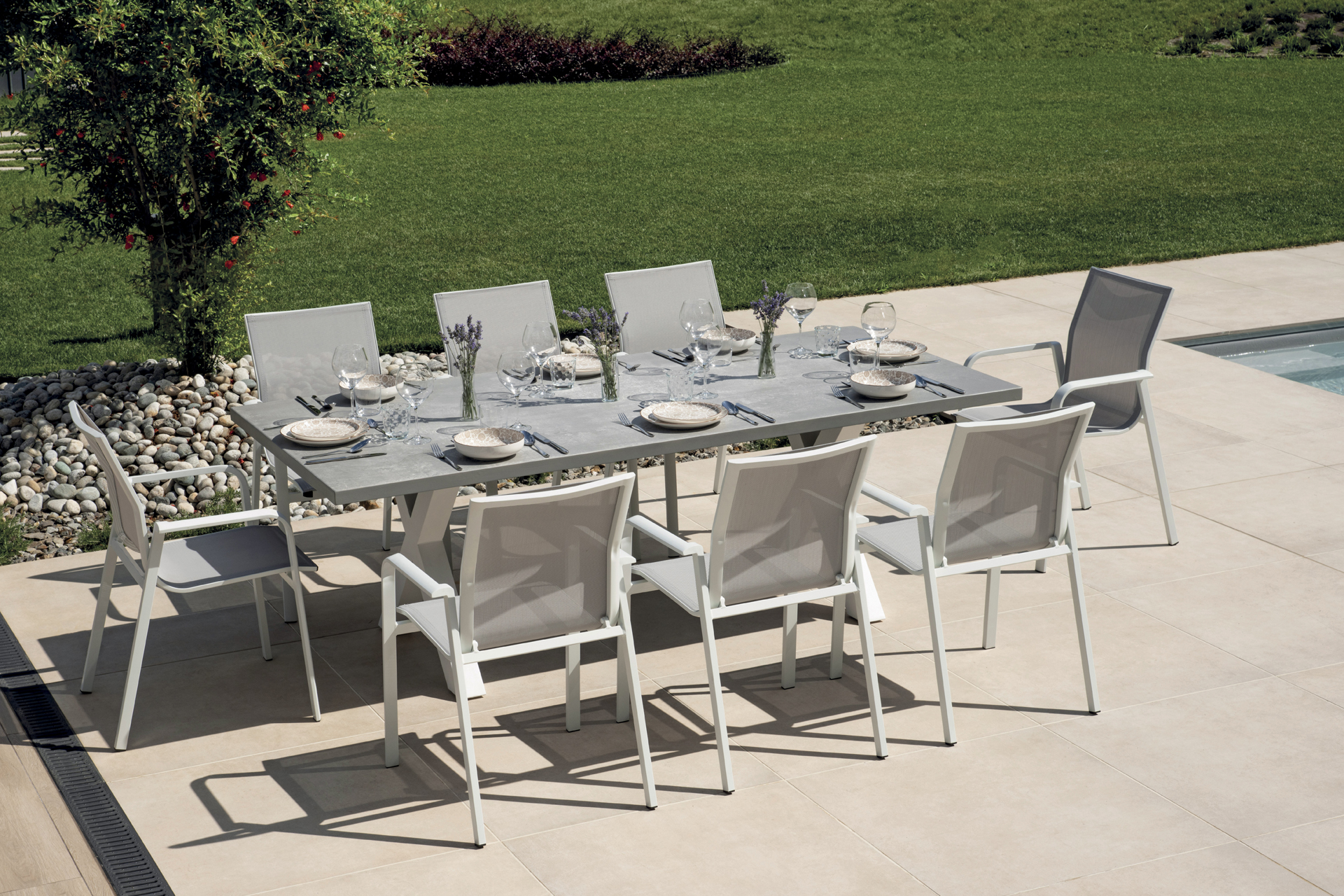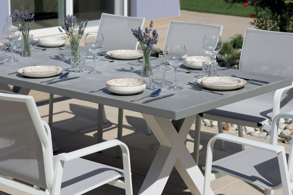 The Amantea 220x100x75 table is designed to offer comfort, durability, and style to outdoor spaces. The white aluminum frame ensures solidity and lightness, while also providing a bright, contemporary aesthetic that enhances gardens, terraces, and verandas.