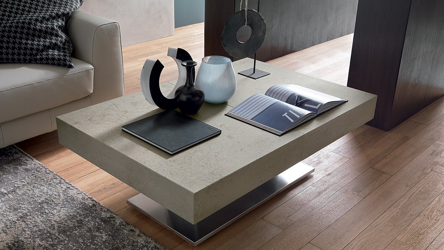 Coffee table convertible into a dining table Ares Mega by Altacom. Central steel structure, gas mechanism adjustable in height to the millimetre from 41 cm to 76 cm. Rectangular top in melamine, lacquered, wood or mortar effect. Two internal extensions and two external extensions. Retractable swivel wheels. Folding support legs.