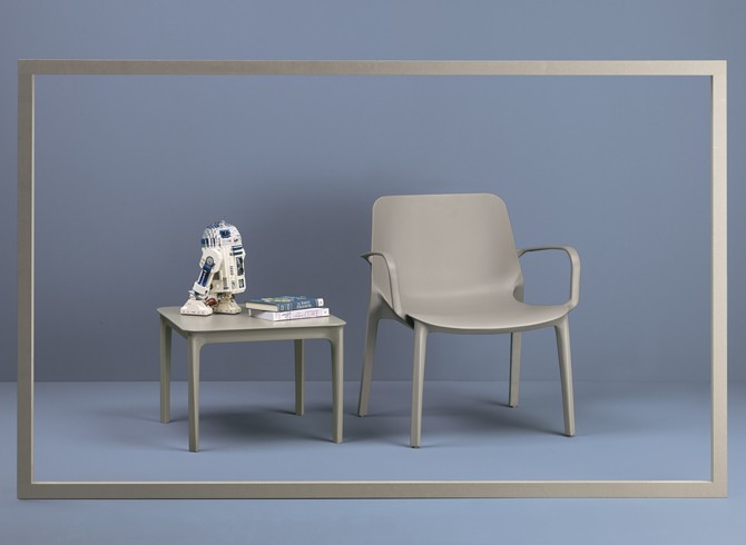 The 40 cm high coffee table has a technopolymer frame. With a youthful and glamorous look, it's versatile and ideal for contract or outdoor use. Stackable up to 4 high. (design Luisa Battaglia)