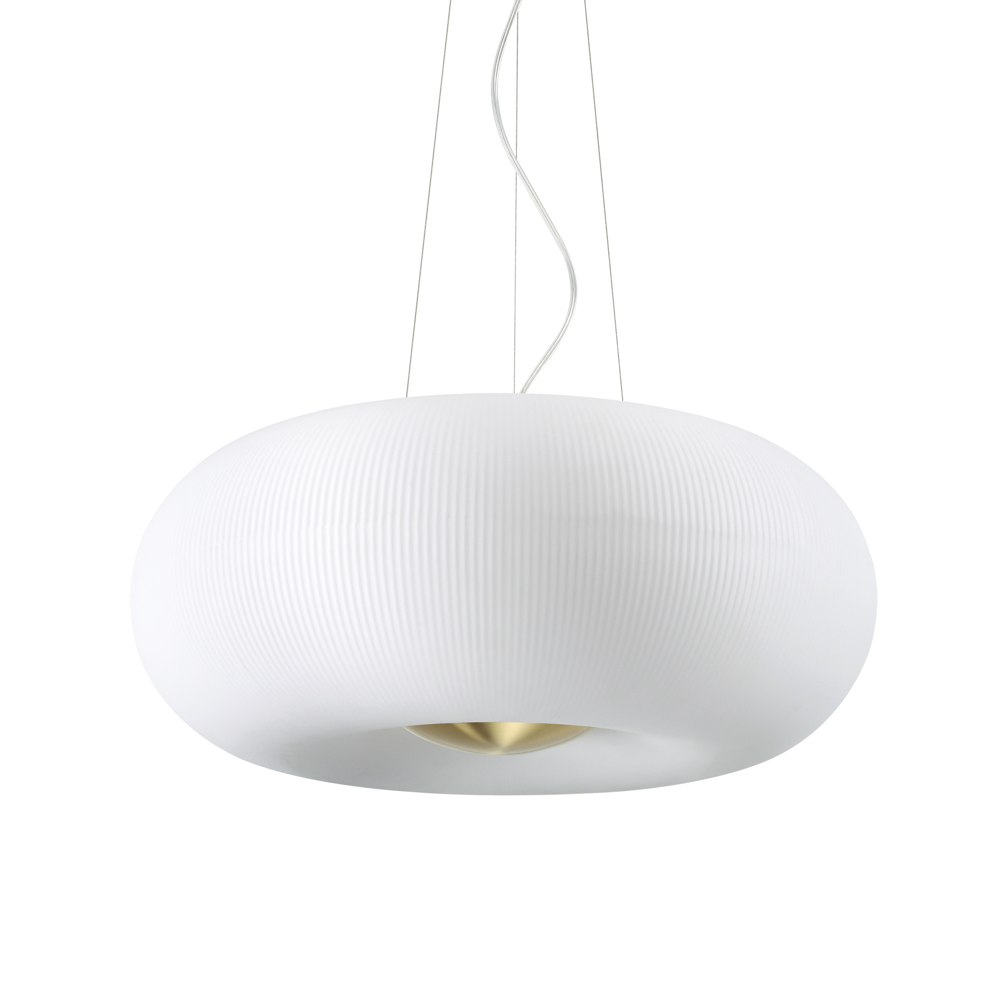 Arizona sp5 pendant chandelier with metal frame finished in satin brass. Diffuser in blown white glass, etched and with decorative grooves in relief. Bulbs included.