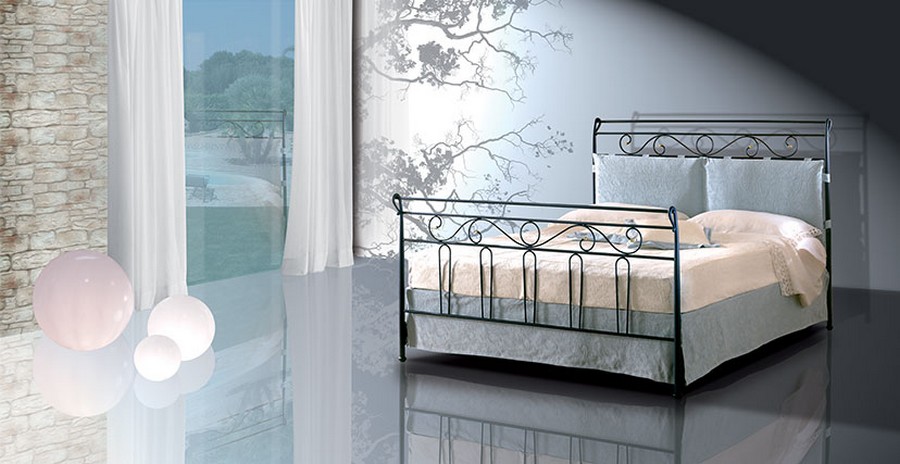 Atlante double bed by Pama Wrought iron beds. A bed available in three different versions: Headboard only, Headboard with bed frame or Headboard and footboard. The bed can be had in various finishes. Possibility of adding a headboard cushion at a surcharge