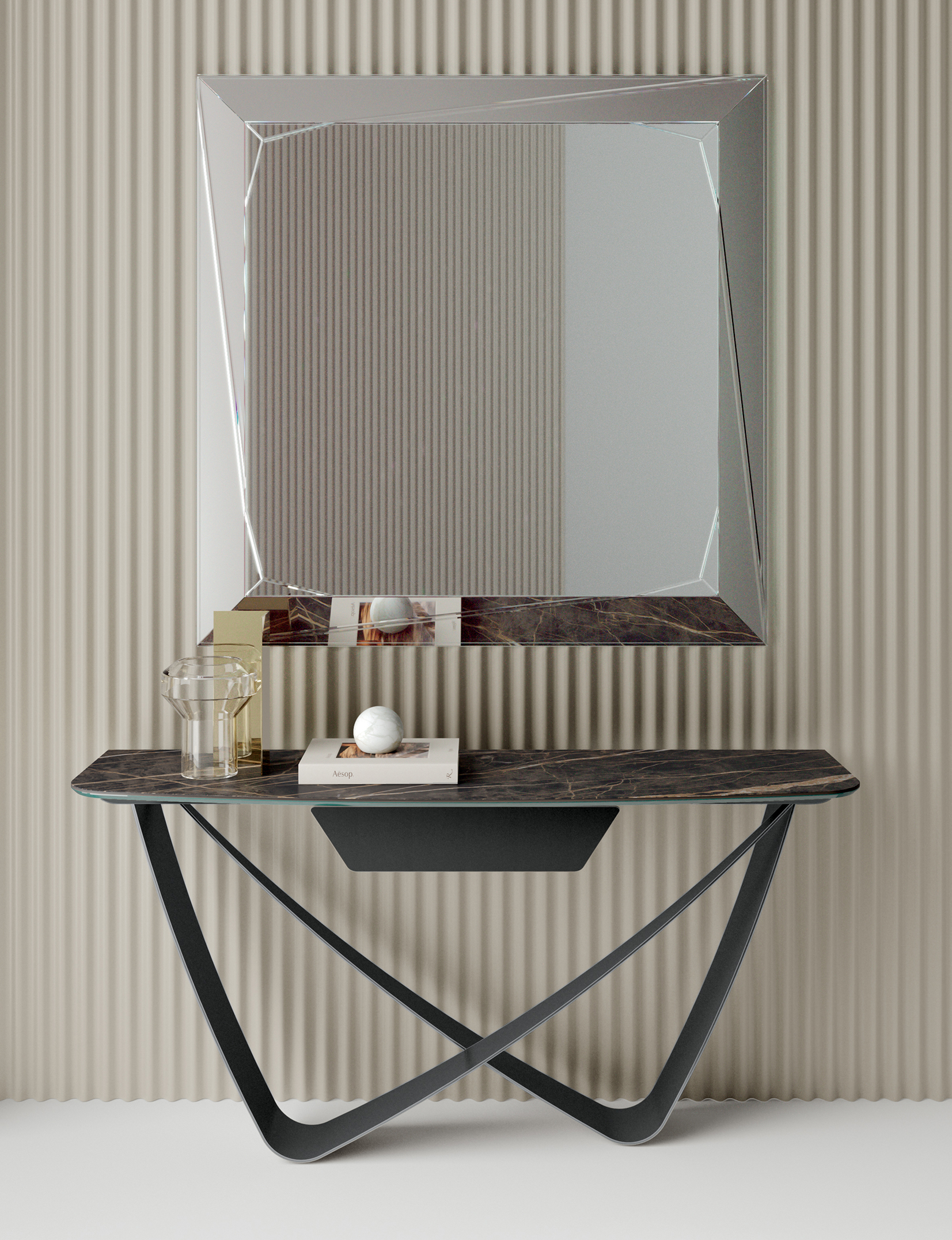The console is characterized by the particular weave of the structure which is in lacquered steel in different finishes, while the top is in lacquered wood or supermarble, also available in different finishes that allow you to customize the console to your taste.