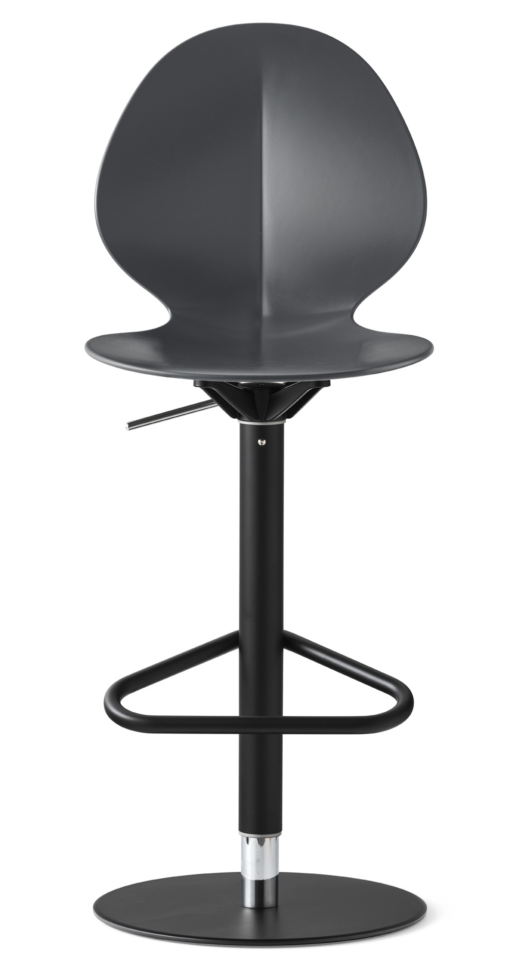 Basil CS2233 stool by Calligaris, with a refined design and metal base. Swivel. The shape of the seat recalls the morphology of a basil leaf. The central rib becomes both a structural and decorative theme of the product. The seat is swivel and adjustable in different heights thanks to the gas lift base. Oval-shaped footrest.