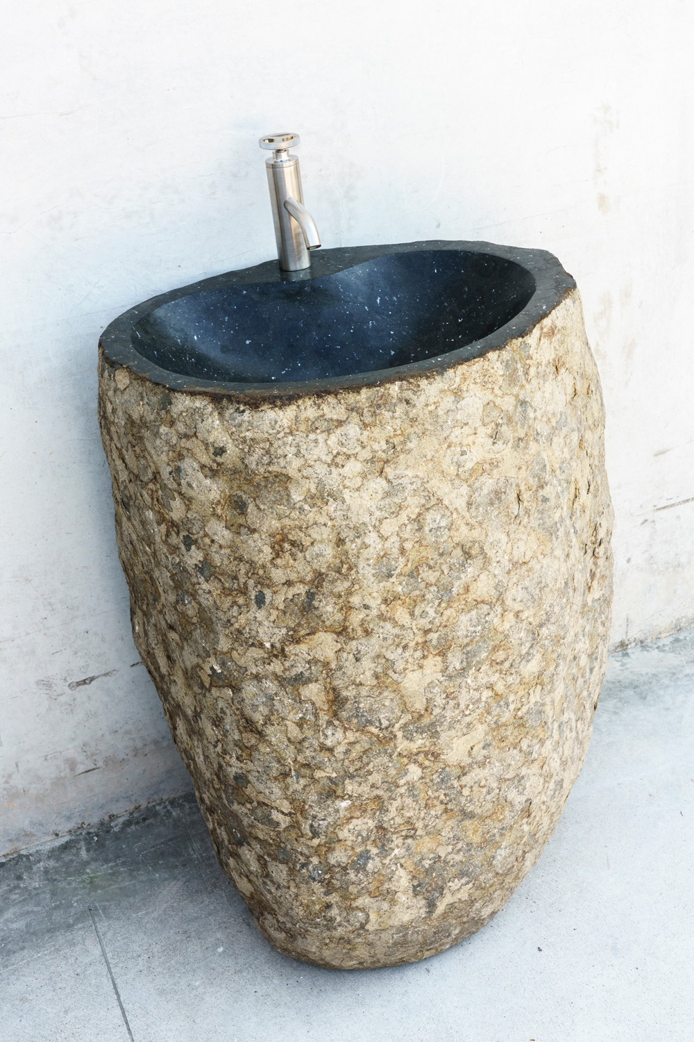 Free standing hand-hewn river stone sink. Rear opening for water connections. Each piece is unique, photo selection service upon order. Available on request without tap hole.