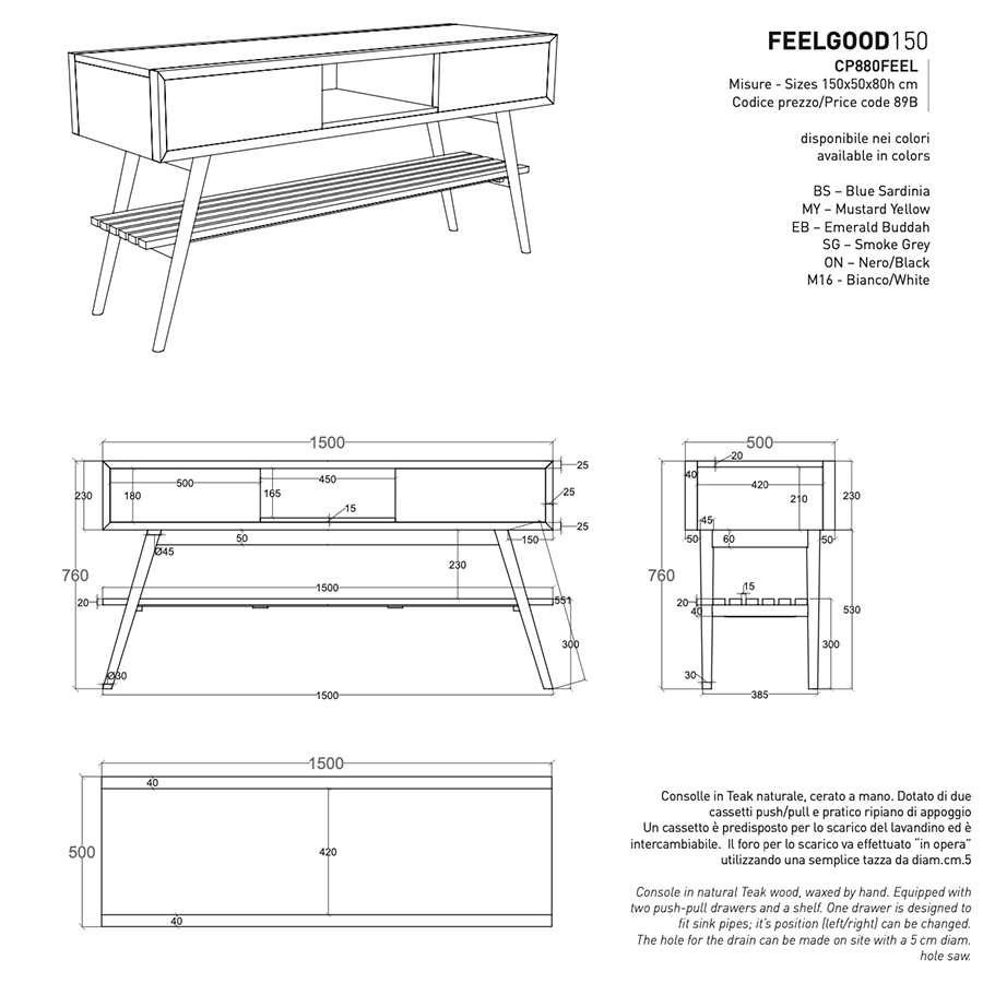Entirely in reclaimed Teak, Mahogany drawers, 45° profiles, new European quality guides, silky touch ... in 6 fantastic colors to unleash your imagination.