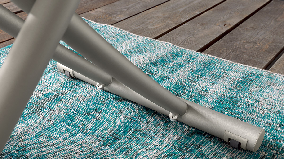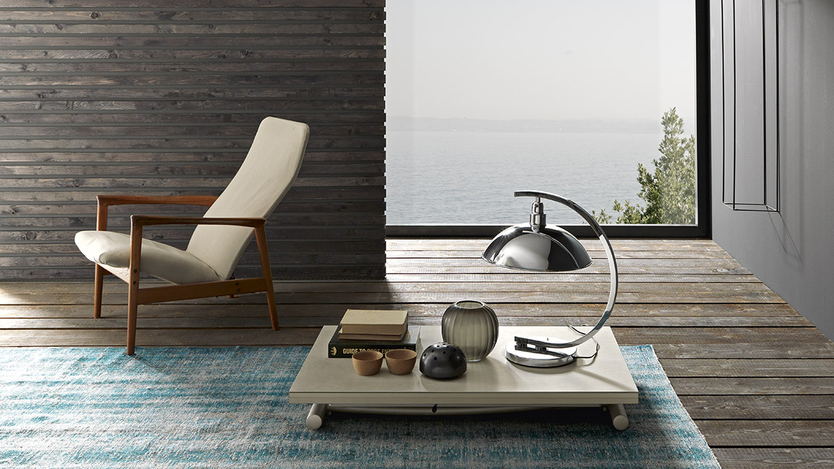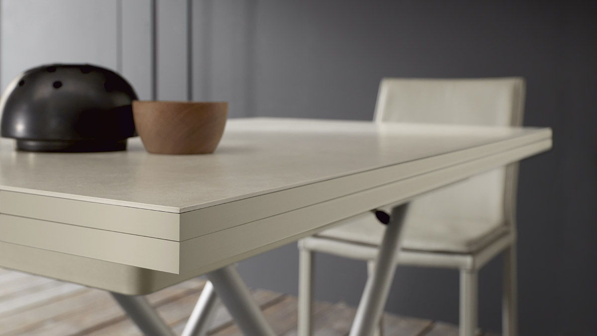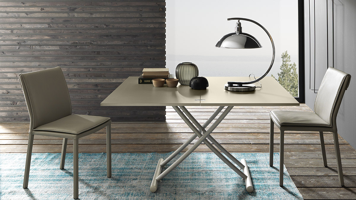 Coffee table convertible into a dining table, metal base, gas mechanism, height adjustable to the millimeter from 16 cm to 78 cm, double-folding top in melamine, glass, mortar effect or ceramic. Retractable wheels.