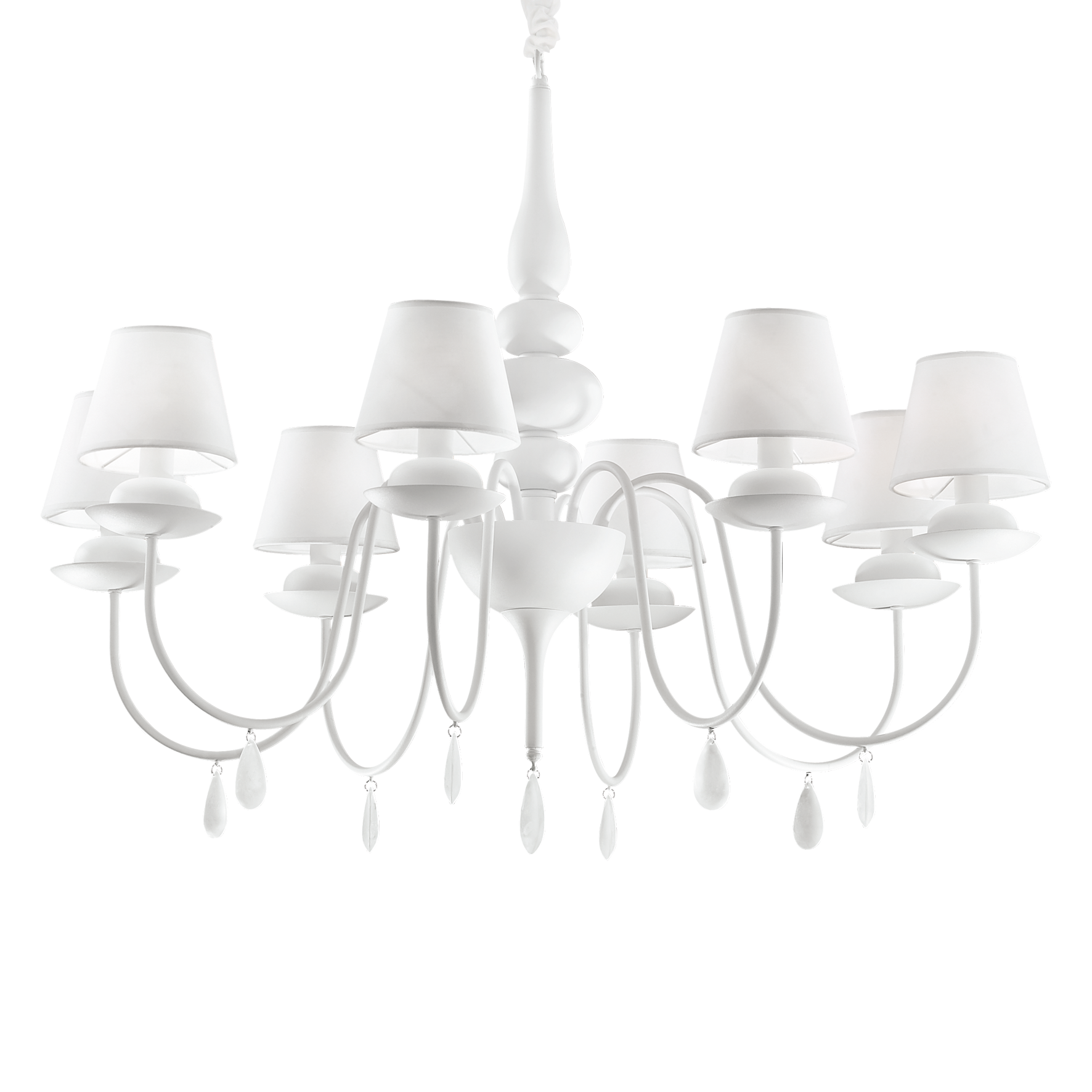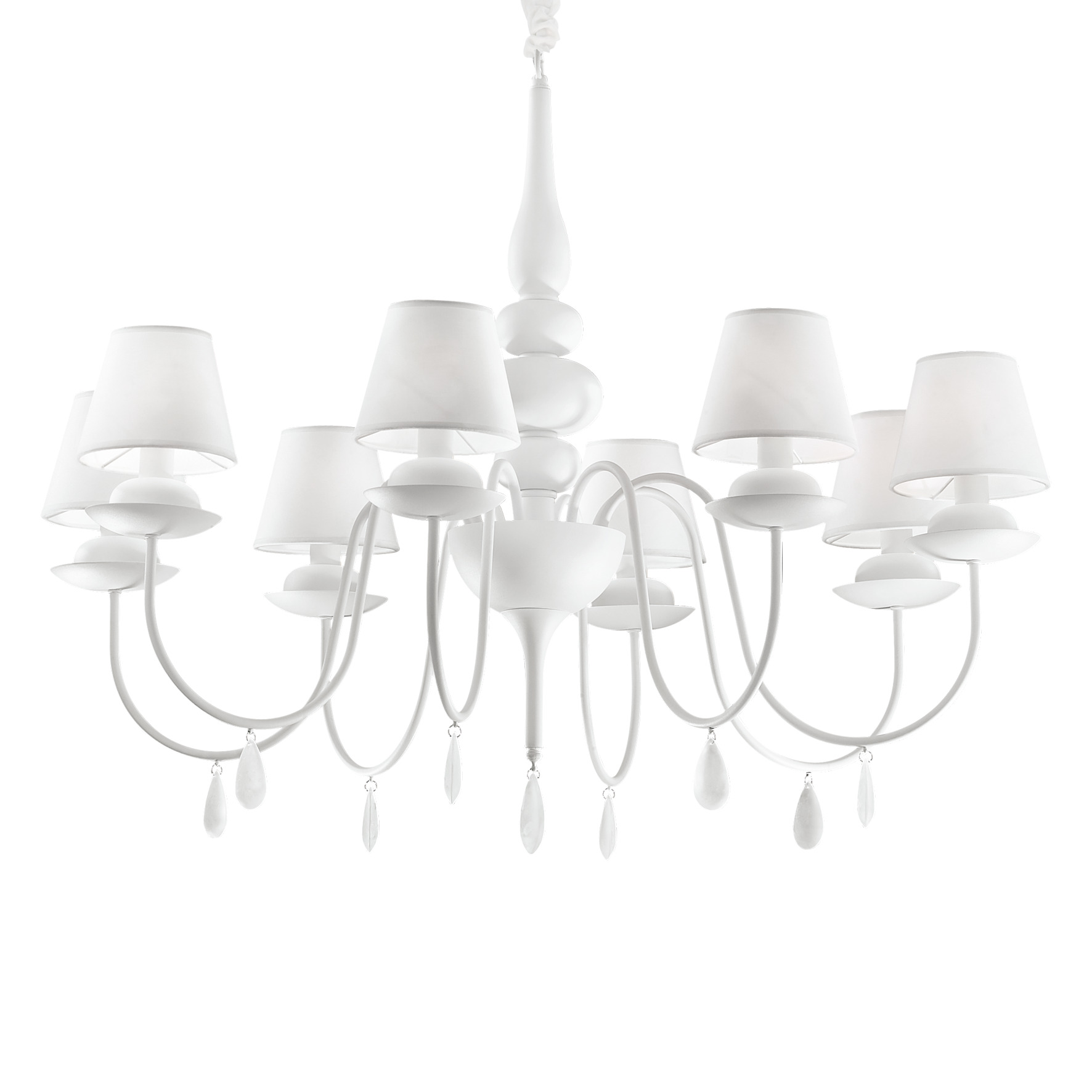 BLANCHE SP8 white pendant lamp by Ideal Lux with metal frame finished with white satin enamel. Lampshades in PVC foil covered with white fabric. Velvet chain cover. Bulbs excluded.