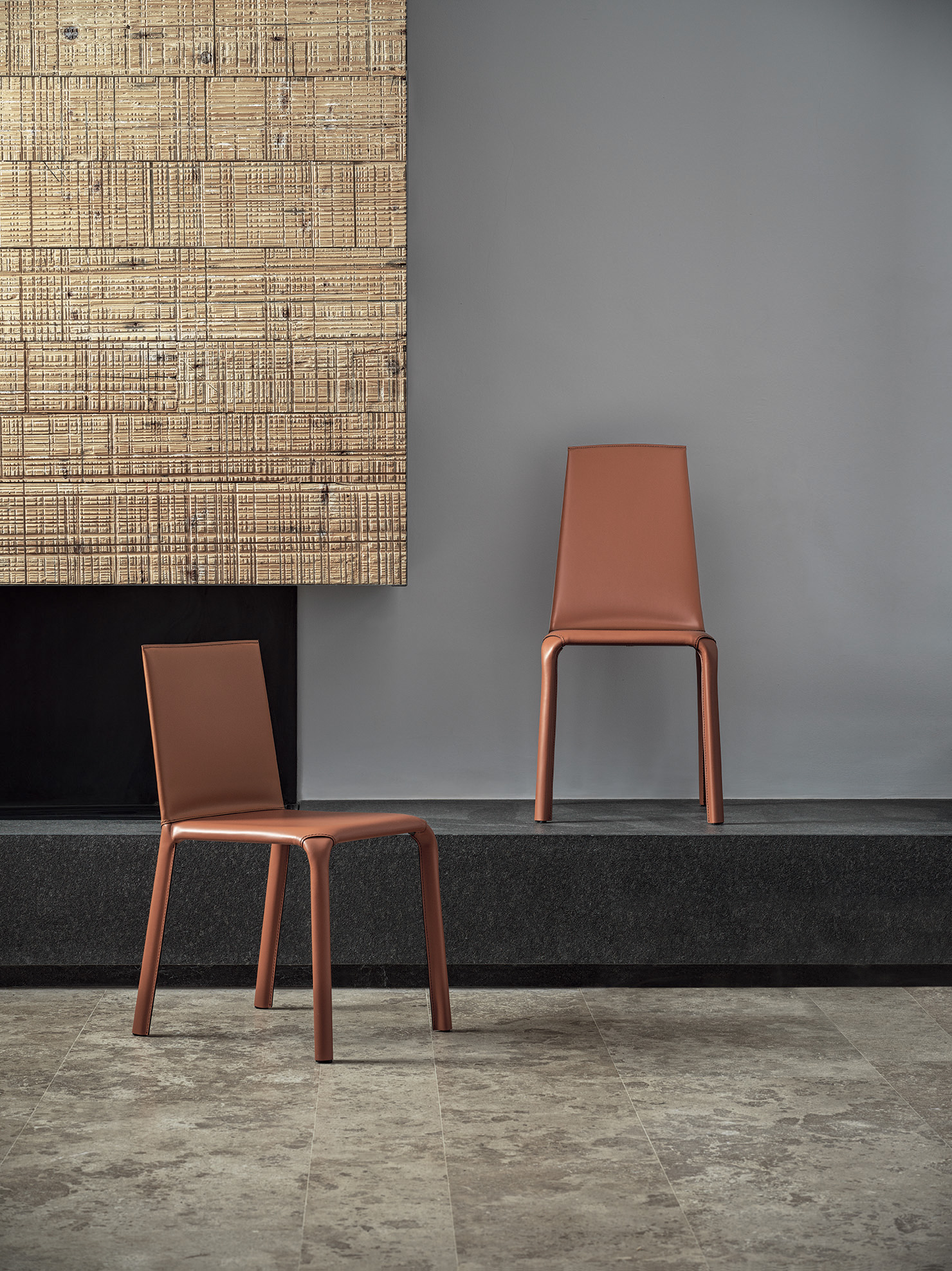 Alice chair by Bontempi characterized by the steel structure completely covered in leather available in various colors. The backrest is optional, in fact the Alice chair in leather is available in a high or low backrest version. The seat is also equipped with a steel structure completely covered in padded leather and is light, solid and resistant. The linear design, the refinement of the materials and the touch of the stitching in the same color or in contrast give the Alice chair in leather by Bontempi a formal elegance that is always current and makes it perfect and suitable for any furnishing context. The artisan care is absolutely evident in the realization of the stitching and the refined intersections of the leather covering.