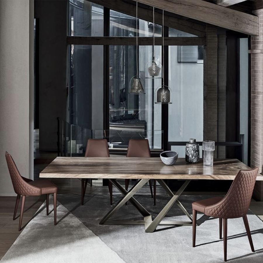 The Clara chair is available in a fully padded and upholstered version or with exposed legs in lacquered steel. Numerous finishes are available for the upholstery with matching or contrasting piping. The soft lines and elegant, retro-style design, revisited in a modern key, make Clara perfect for accompanying dining tables or for being placed in rooms with an essential and refined style.