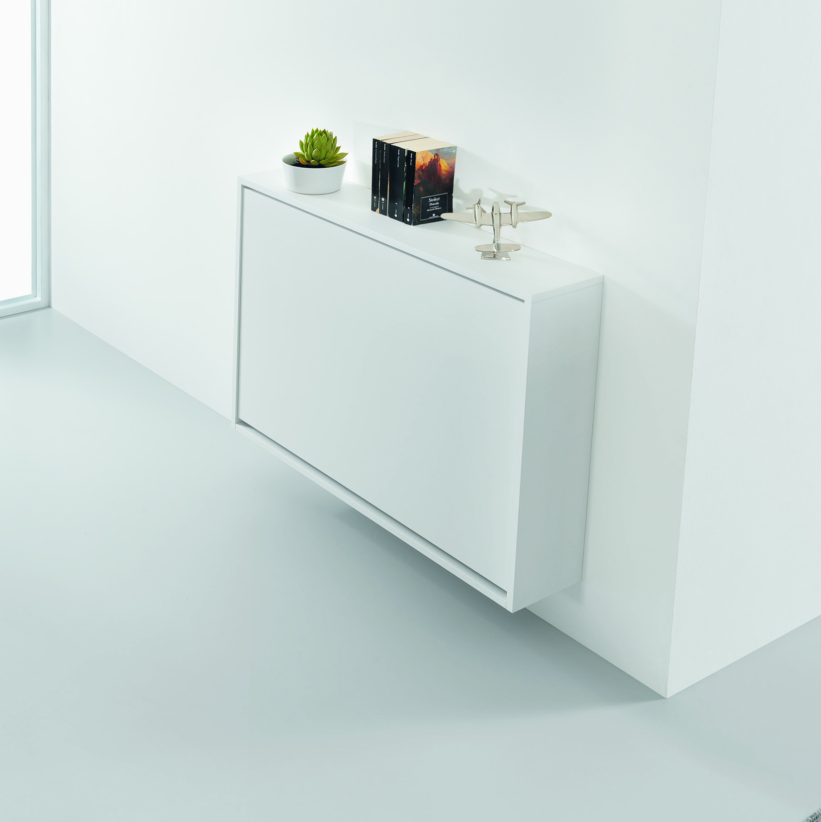 Folding wall-mounted Bureau table/desk, made of 18 mm eco-friendly laminate. The interior can hold up to three folding chairs (each 45 x 46 x 78 cm high) and can be complemented by the 0/67 wall-mounted bookcase, which has the same width and depth. It can be used as a side table, desk, or for any other temporary storage needs.