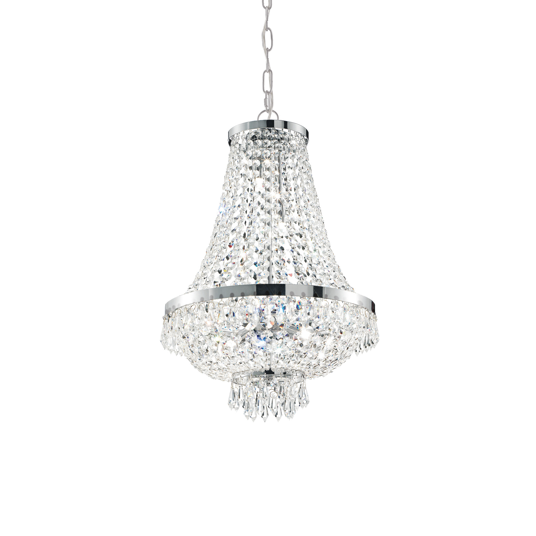 CAESAR SP6 chrome pendant chandelier by Ideal Lux with metal frame with chrome finish. Octagonal cut crystal decorative elements with pointed ends. LED bulbs included.