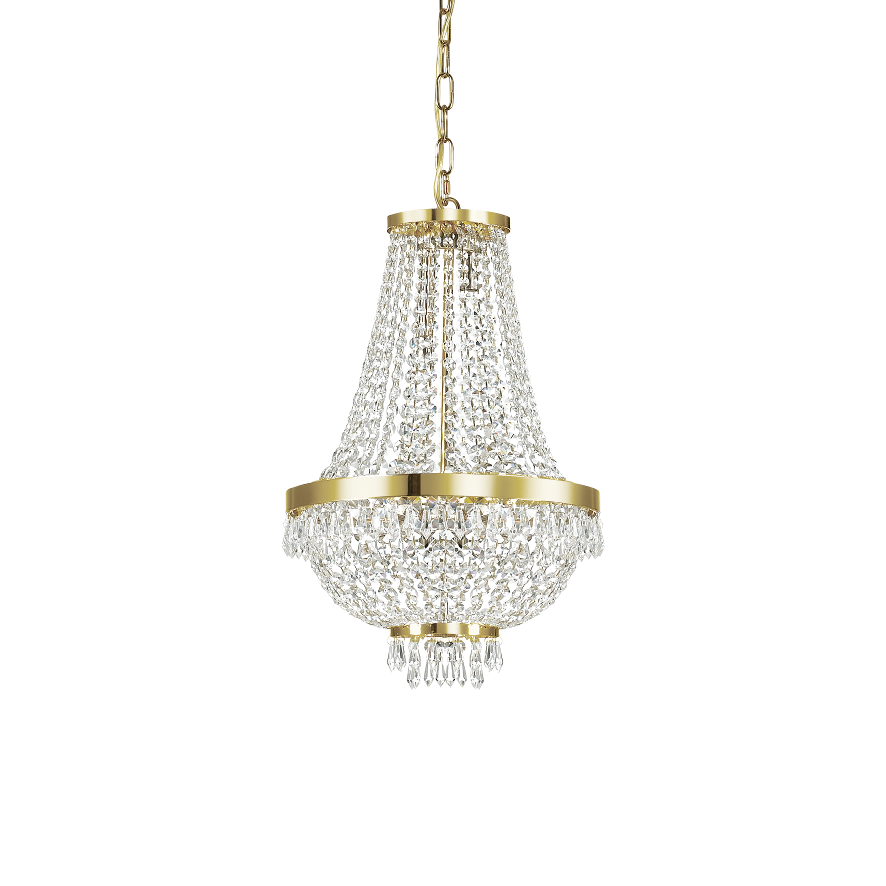 CAESAR SP6 gold pendant chandelier by Ideal Lux with metal frame with gold finish. Octagonal cut crystal decorative elements with pointed ends. LED bulbs included.