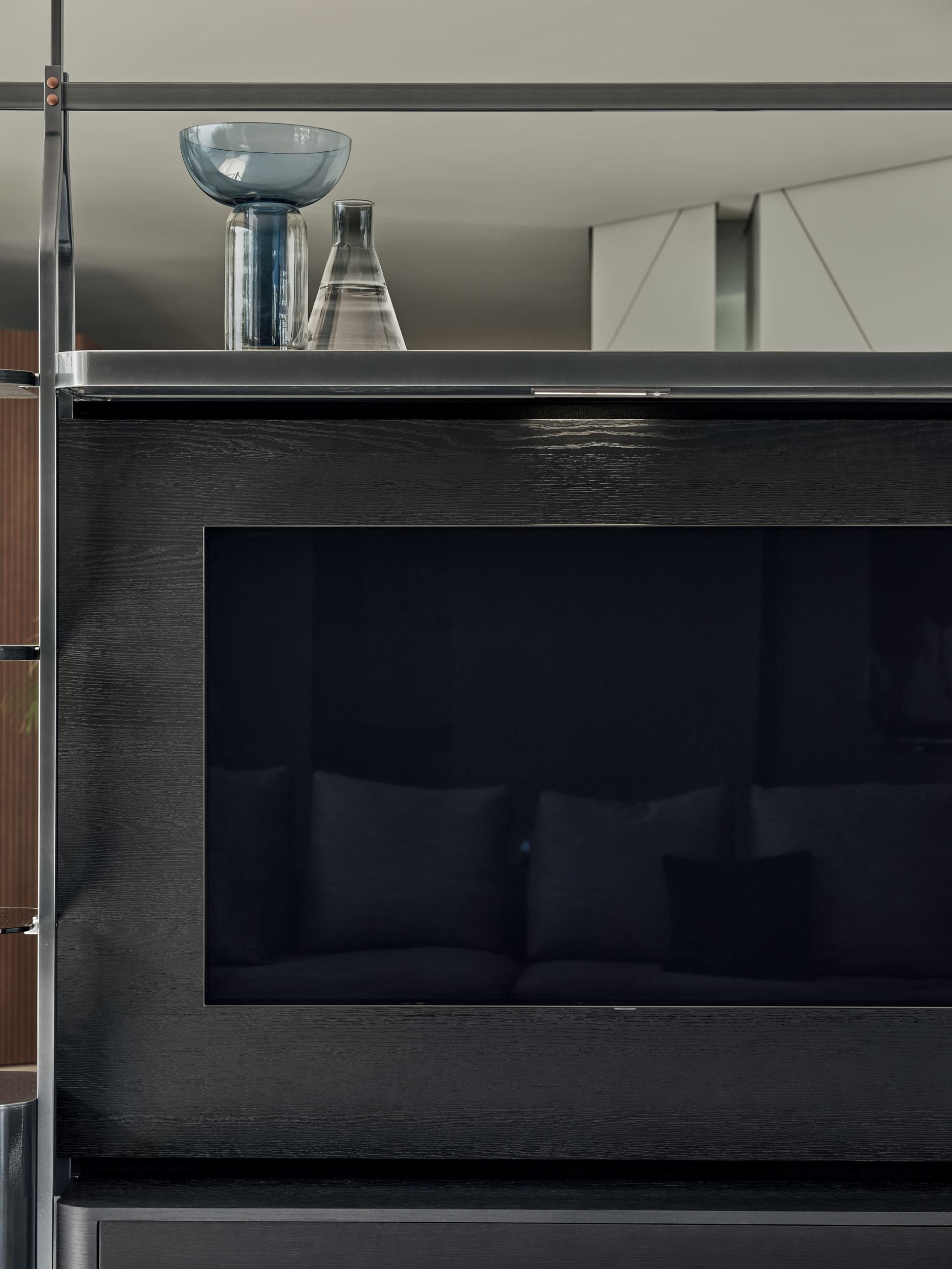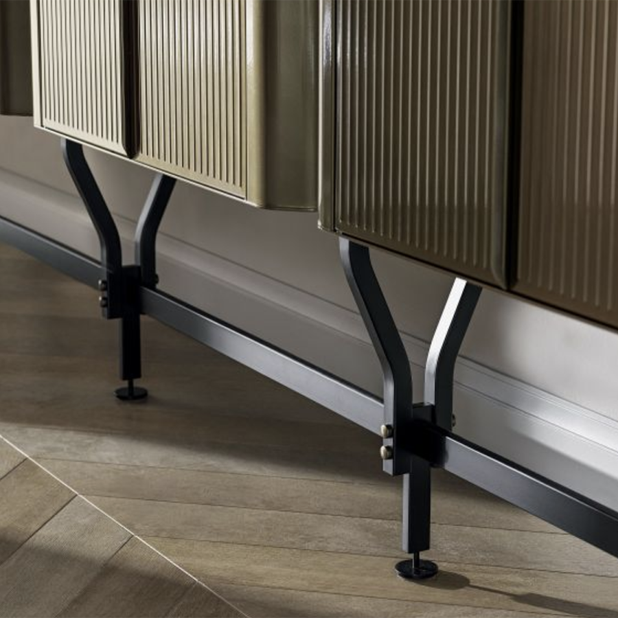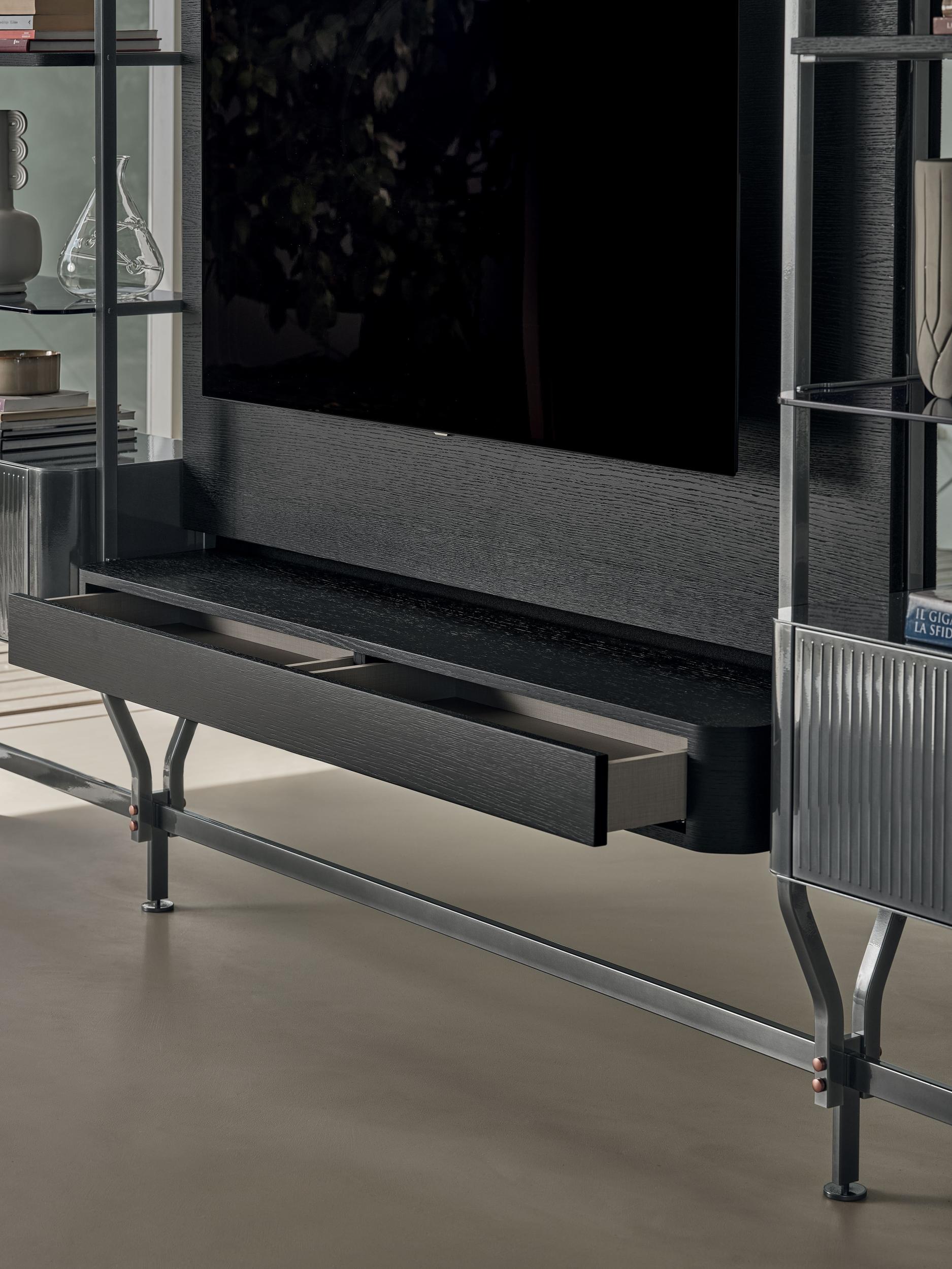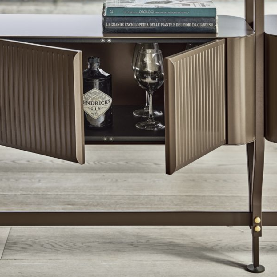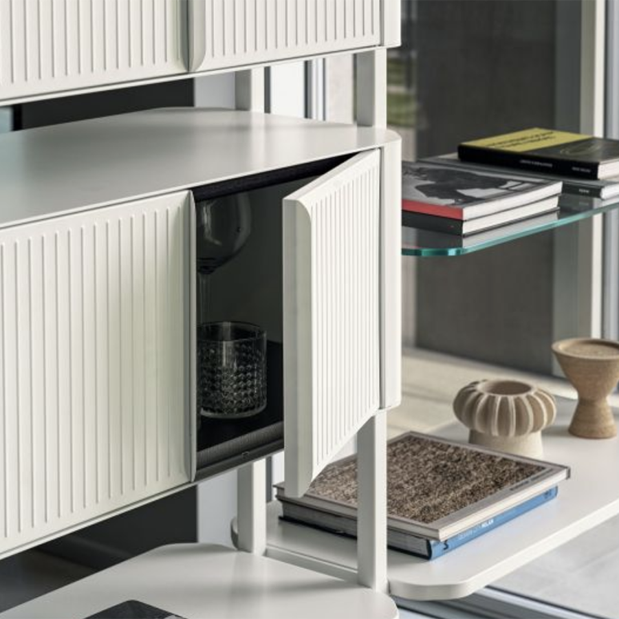 Containers with doors with lacquered steel structure, lacquered aluminium shelves and top in crystal, lacquered wood and veneered wood.