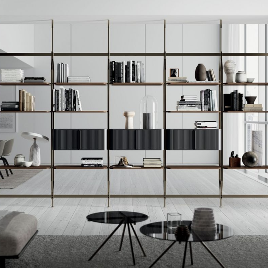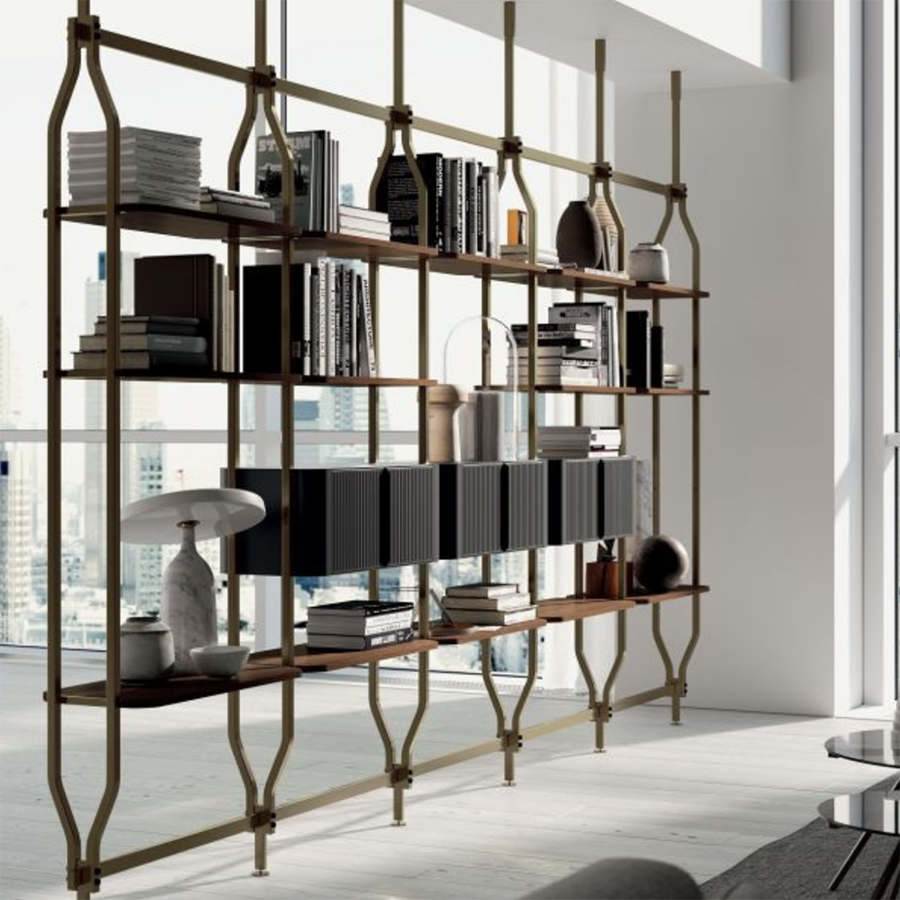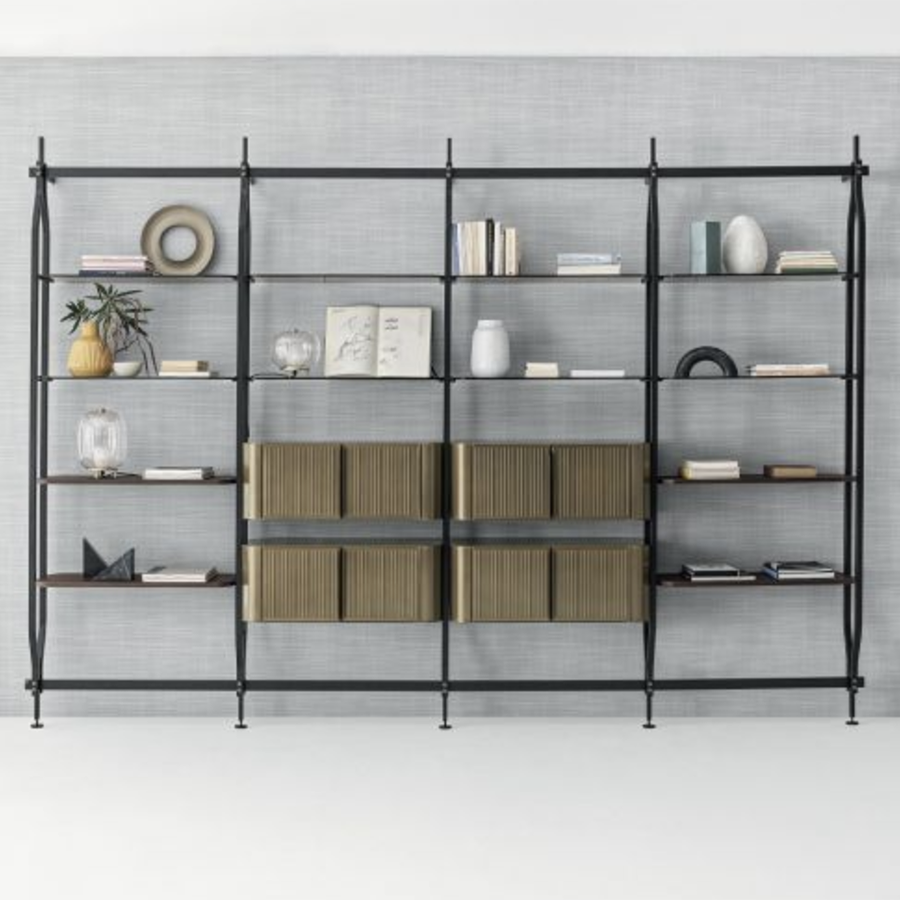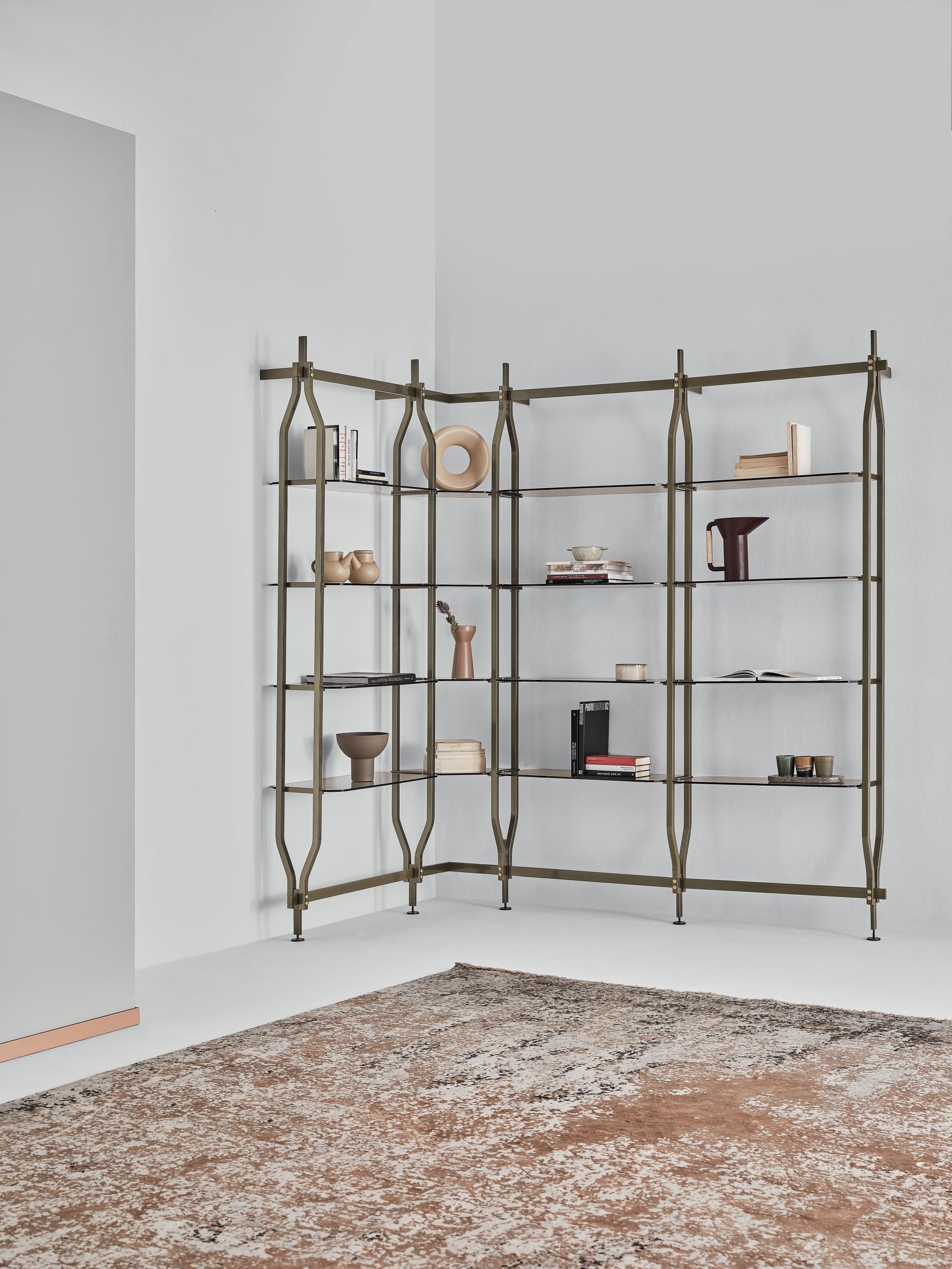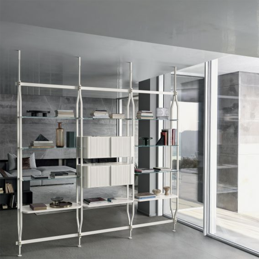 Bookcase and additional module with ceiling or wall fixing, designed to accommodate up to 4/8/12/16/20 shelves and/or optional containers. Structure, crosspieces and decorative details in lacquered steel.