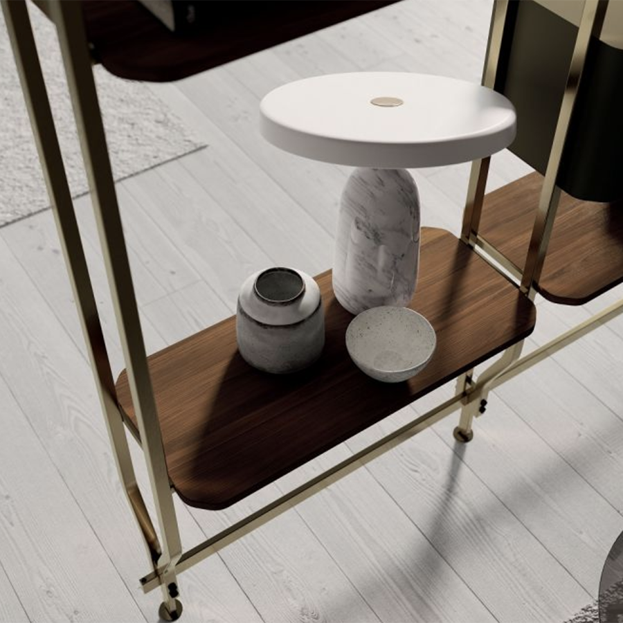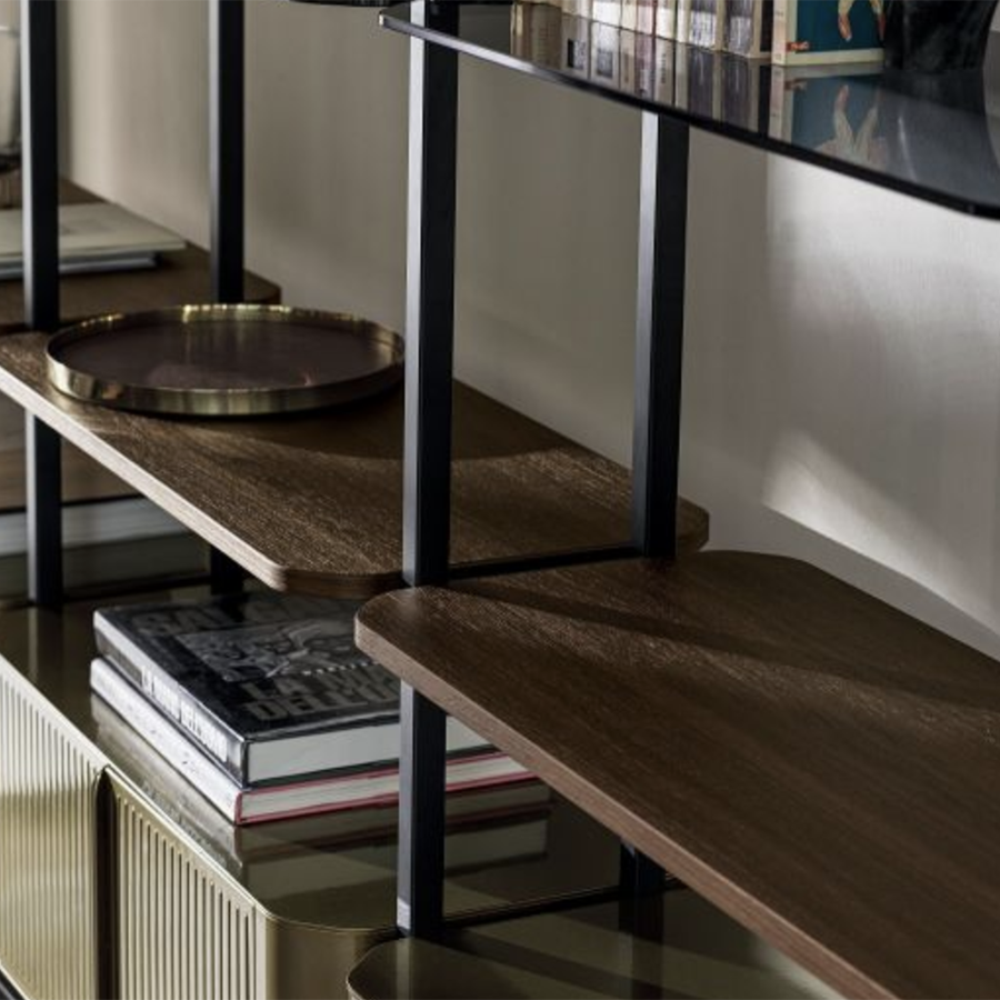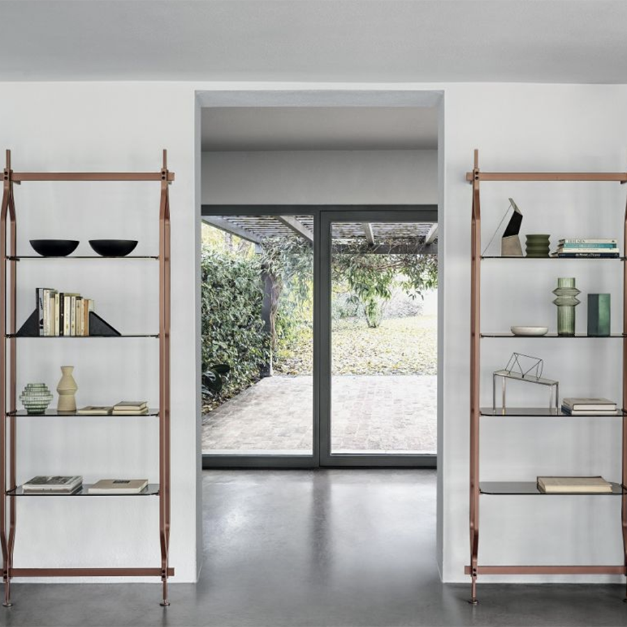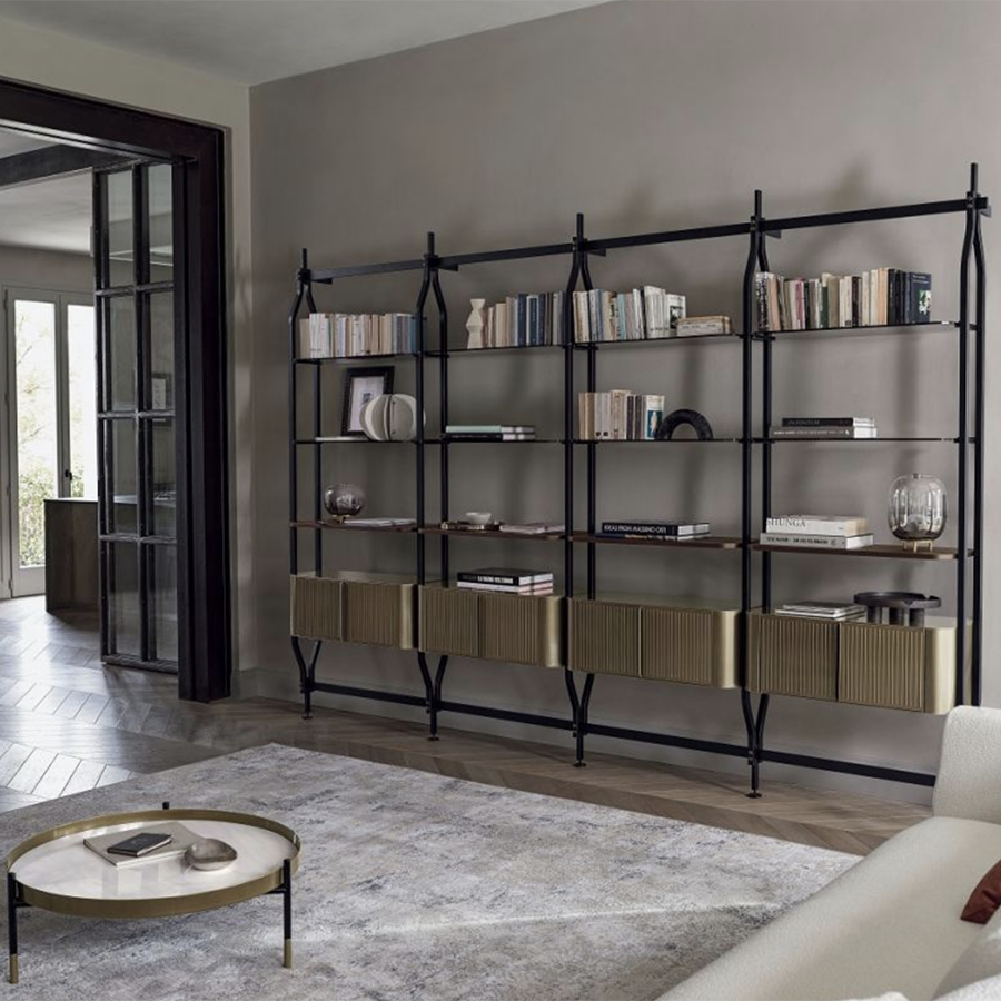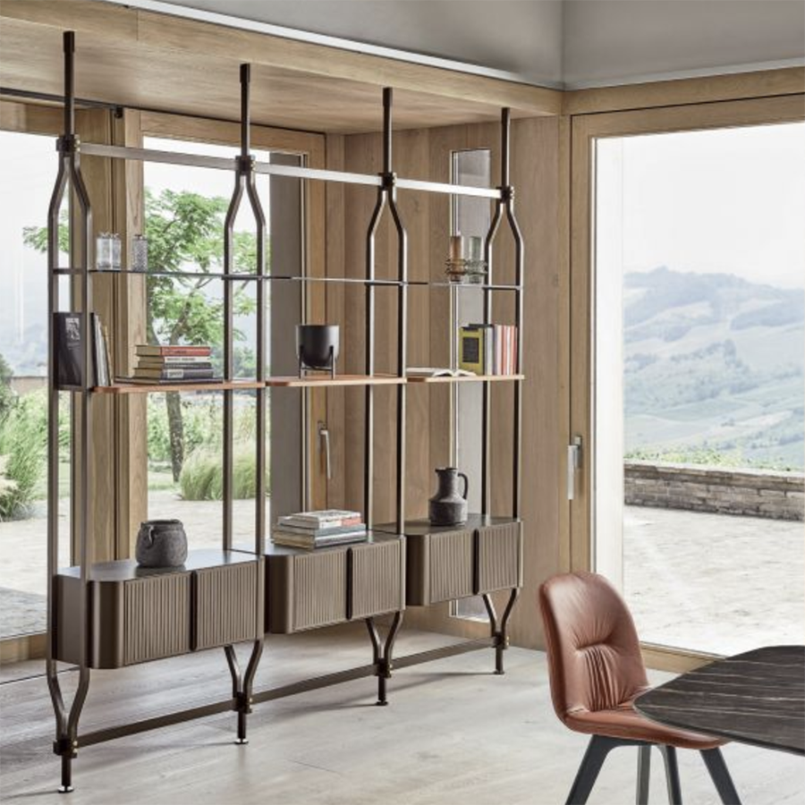 Bookcase and additional module with ceiling or wall fixing, designed to accommodate up to 4/8/12/16/20 shelves and/or optional containers. Structure, crosspieces and decorative details in lacquered steel.