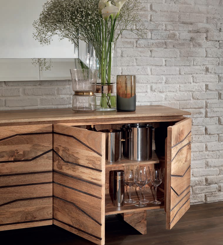 The Chitra sideboard has a solid mango wood structure. The doors feature elegant black geometric milling.