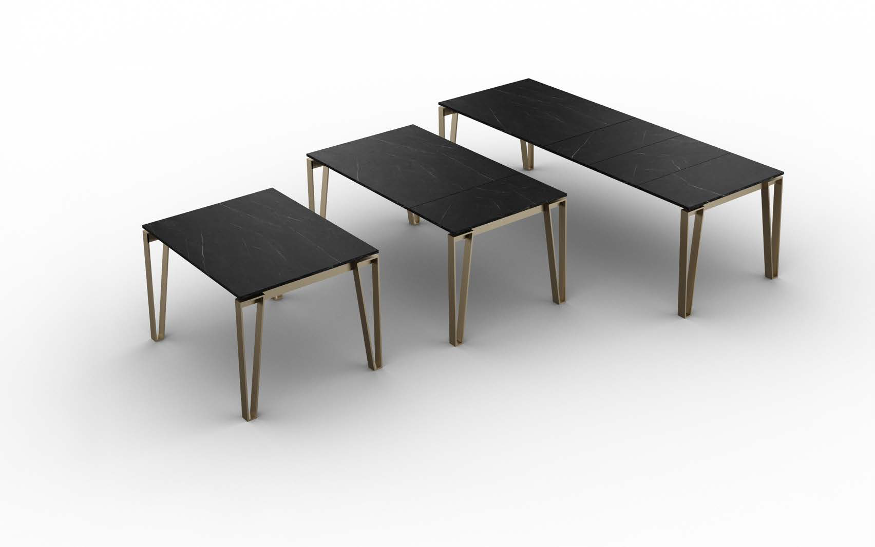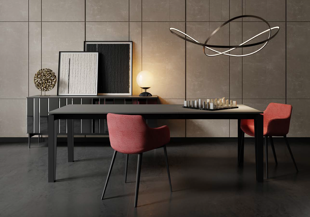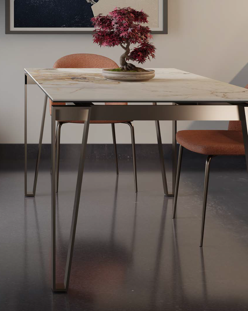 Fixed or extendable table with patented telescopic opening aluminium guide, painted metal base and top and extensions in different materials and finishes.