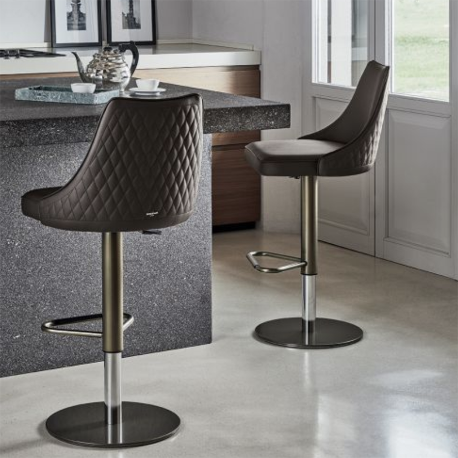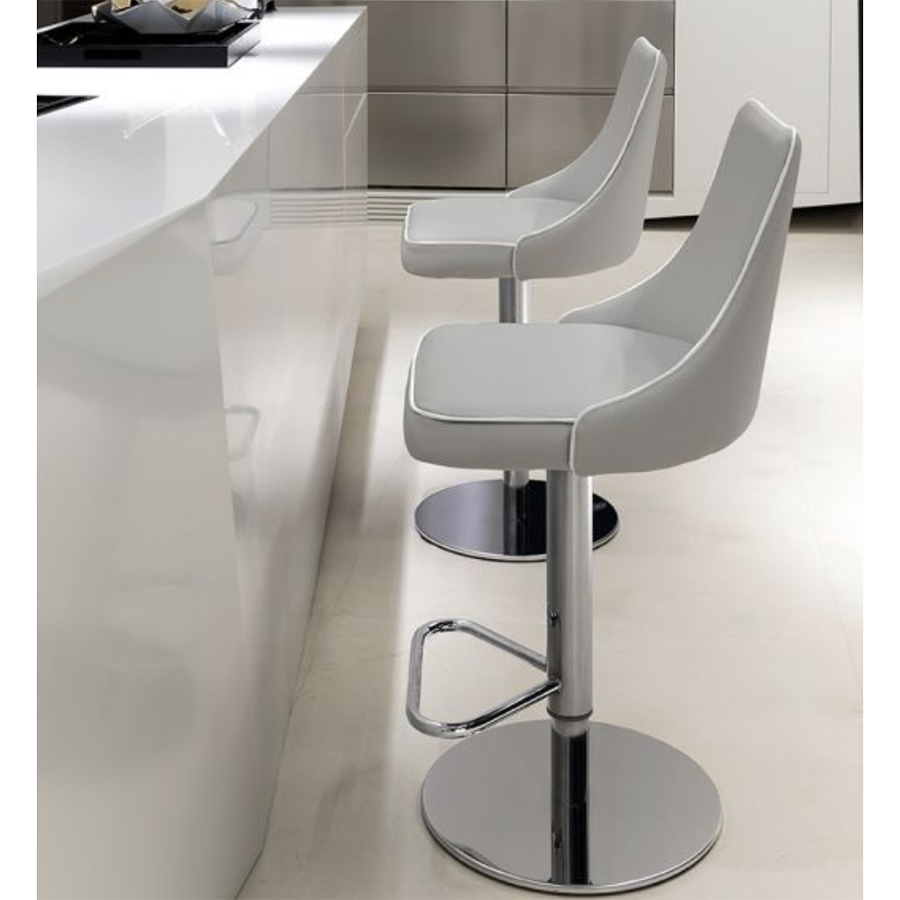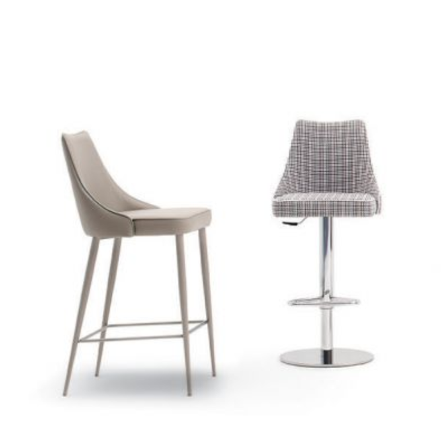 Clara stool by Bontempi available in two different heights and in the swivel and height-adjustable version. It is characterized by the lacquered steel structure in different finishes. The shell is completely padded and covered and has the particularity of the edges that can be made in the same color as the chosen covering or in contrast and is available in different finishes. The version of the Clara stool with contrasting edge highlights the profile even better, enhancing its soft lines and elegant design and retro taste, revisited in a modern key that make the stool with an essential and refined style.