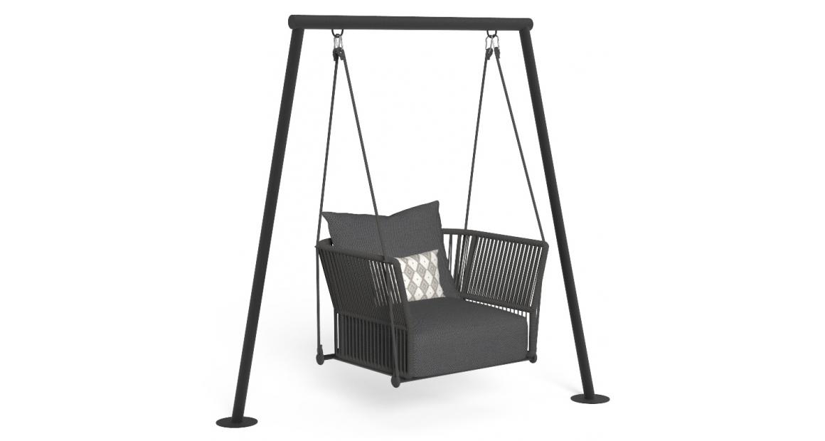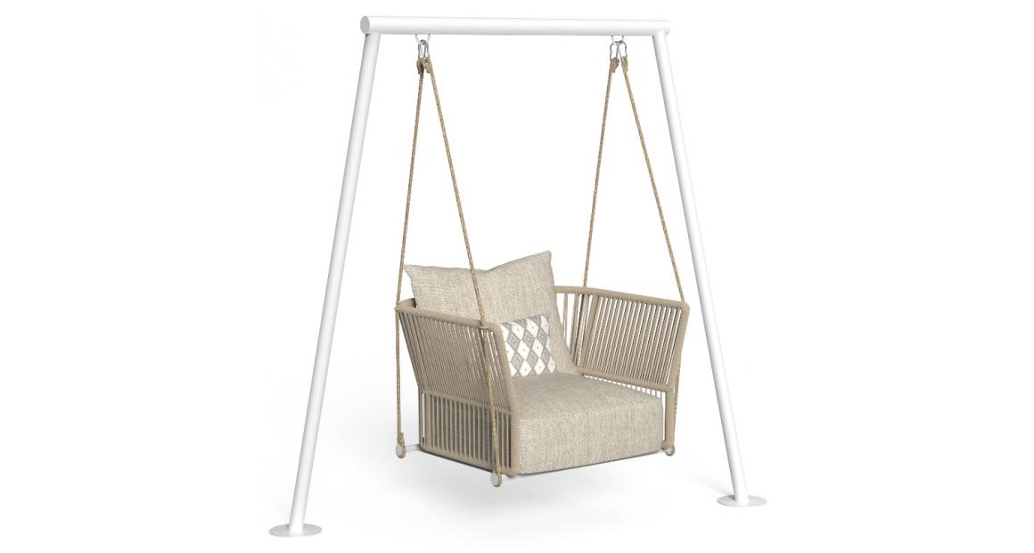 The Swing from the Cliff collection is ideal for personalizing an outdoor space. The collection's signature elements, such as the use of synthetic nautical rope to cover the backrest and armrests, complement the product's innovative shape. The Swing, supported in its movement by ropes attached to the base, maintains the safety of the aluminum frame, along with the comfort of the seat, made of quick-dry foam and upholstered in weather-resistant fabric.