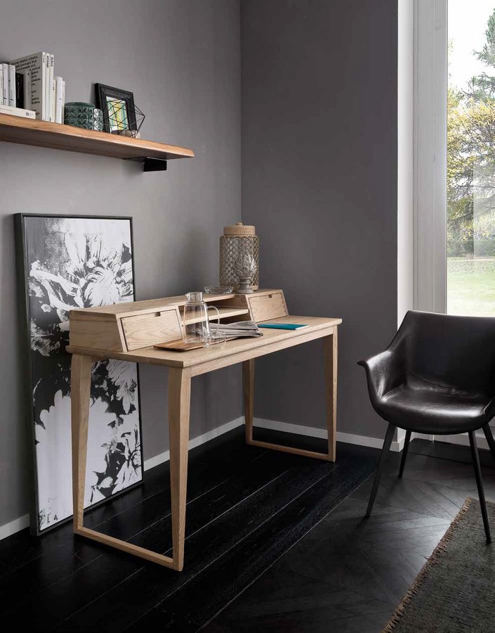 Clover desk by Altacorte with two drawers by Altacorte. Entirely available in different types of oak wood in different finishes. With simple lines, this desk will give a unique touch to your bedroom.