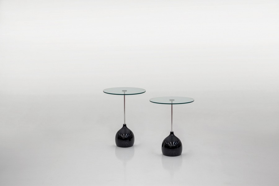 Adachi coffee table by Tonin Casa with base in a ductile and performing material such as marble aggregate, long and slender chromed metal stem that opens in a tempered glass top, which allows the creation of a particular shape that recalls a elegant still. Adachi is available in two heights and is perfect alone or in pairs in different heights.