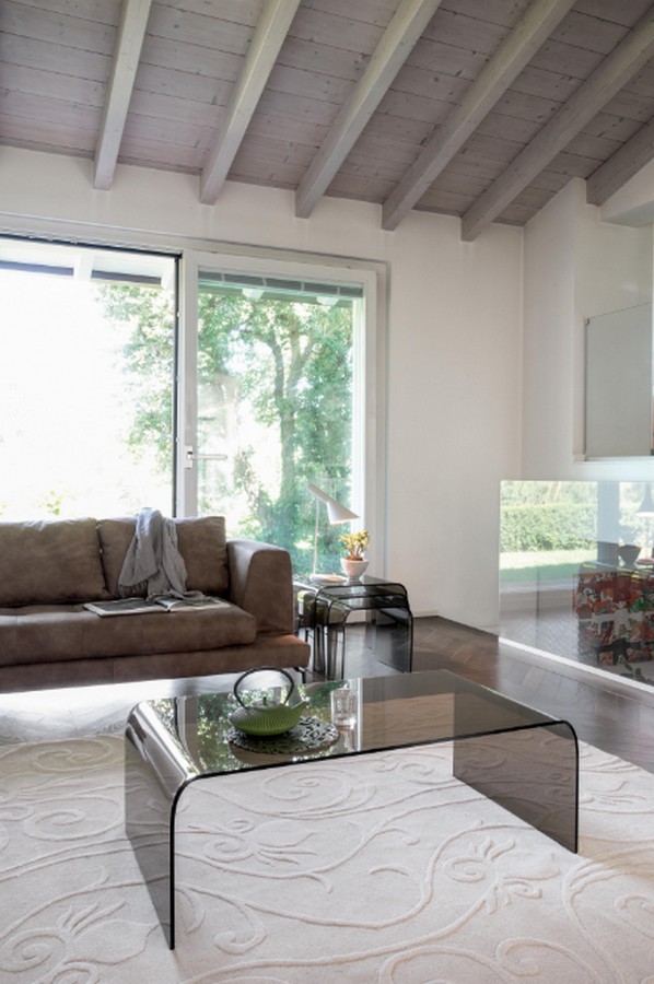 The anemone coffee table by Tonin Casa is in curved glass with glass or wooden shelf. Anemone is a coffee table that lets you glimpse its shapes, but hides and protects a containing area for your most precious objects. a curved wooden structure covers the wooden or glass shelf, breaking a continuous line to create rhythm and complexity. The versions available, such as single tables and servants. or as a trio of tables. allow anemone to place itself in the most disparate places.