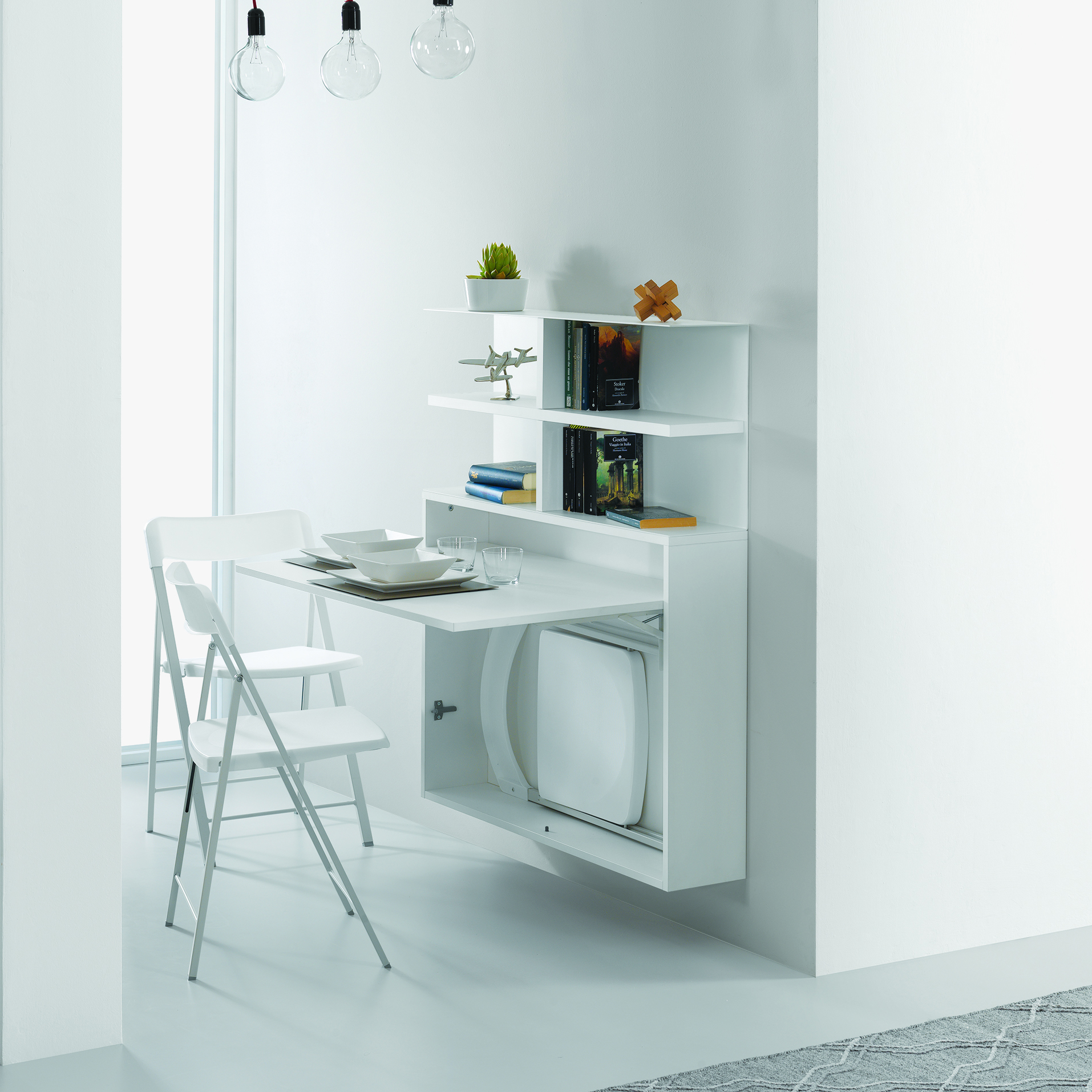 Folding wall-mounted Bureau table/desk, made of 18 mm eco-friendly laminate. The interior can hold up to three folding chairs (each 45 x 46 x 78 cm high) and can be complemented by the 0/67 wall-mounted bookcase, which has the same width and depth. It can be used as a side table, desk, or for any other temporary storage needs.