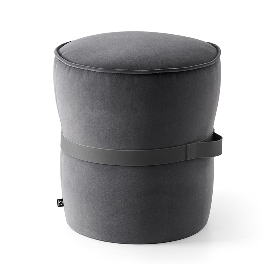Connubia round pouf completely padded and upholstered in fabric with pinched stitching on the perimeter of the seat. The band with decorative handle made of rubber (decorative strap in eva, ethylene vinyl acetate) is hemp colored for the cros versions and is dark gray for the mat versions. The feet are in nylon.