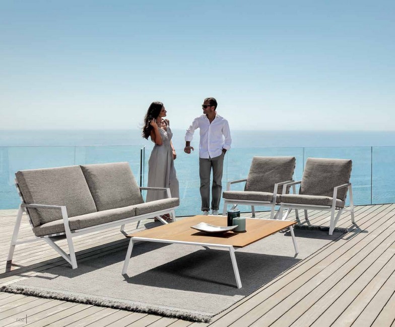 The Cottage living room armchair harmoniously combines traditional materials such as rope with lighter, more contemporary materials such as the aluminum frame and the synthetic bands that support the seat and backrest.