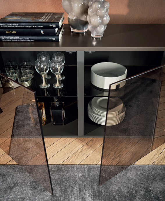 Elegant and minimalist, the glass door is reinterpreted in bronze and smoked versions, with optional internal lighting. Designed for contemporary living spaces, Crystal is reminiscent of antique sideboards, where crockery and glassware were left on display.