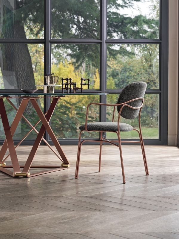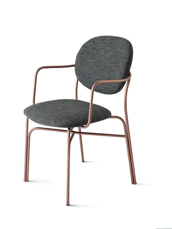 Chair with or without armrests, lacquered steel frame, padded seat and upholstered in various finishes and colors. Soft lines run along the chair, enhancing its entire personality. Available with or without armrests, this chair lends itself to being worn in a wide variety of finishes that make it an object of maximum expression.