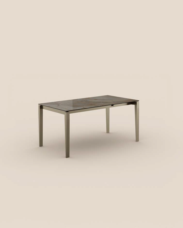 Fixed or extendable table with patented telescopic opening aluminum guide, metal base and top and extensions in different materials and finishes.