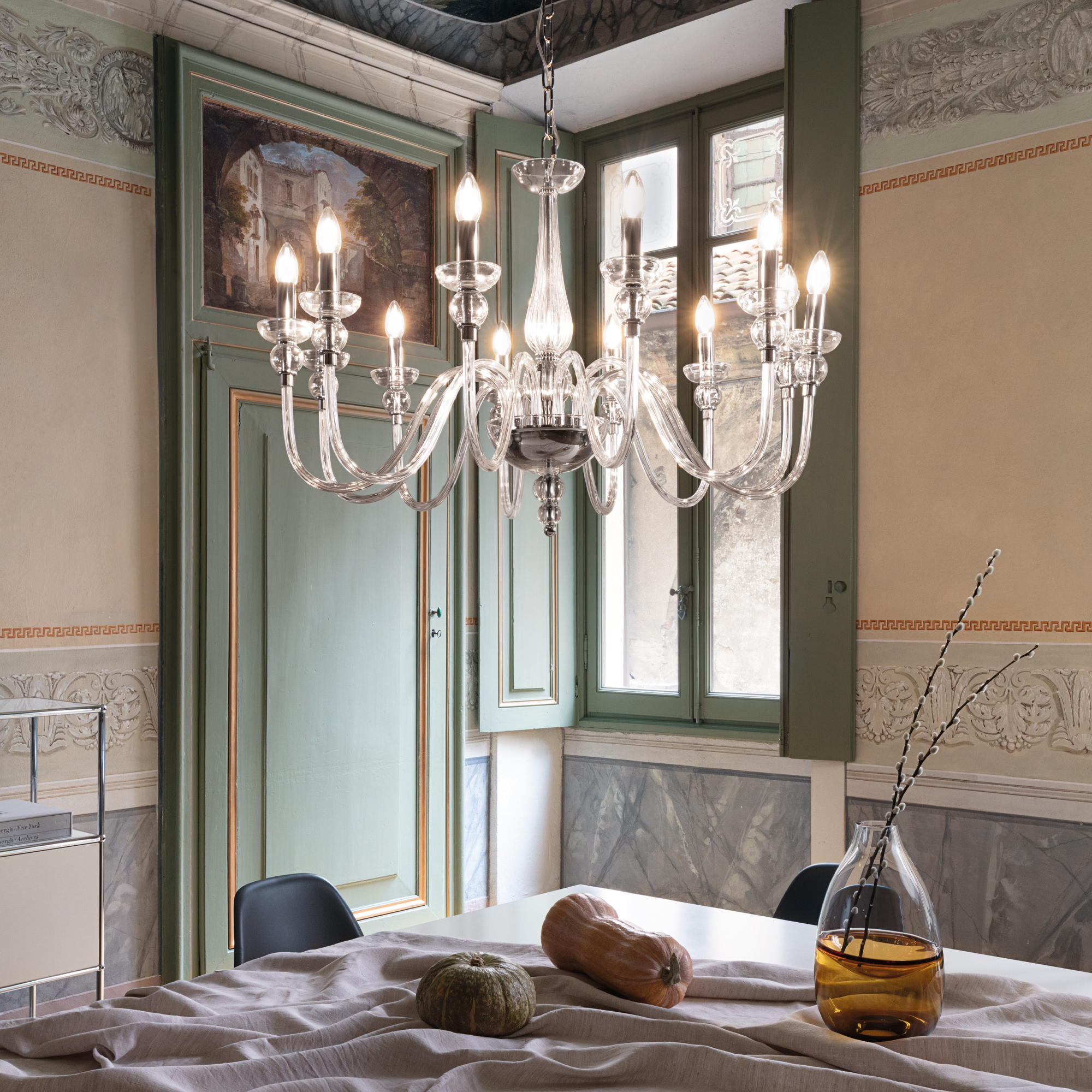 DOGE SP12 transparent pendant lamp by Ideal Lux. Chandelier in transparent blown and hand-crafted glass. Frame and details in metal finished in chrome. Bulbs excluded.