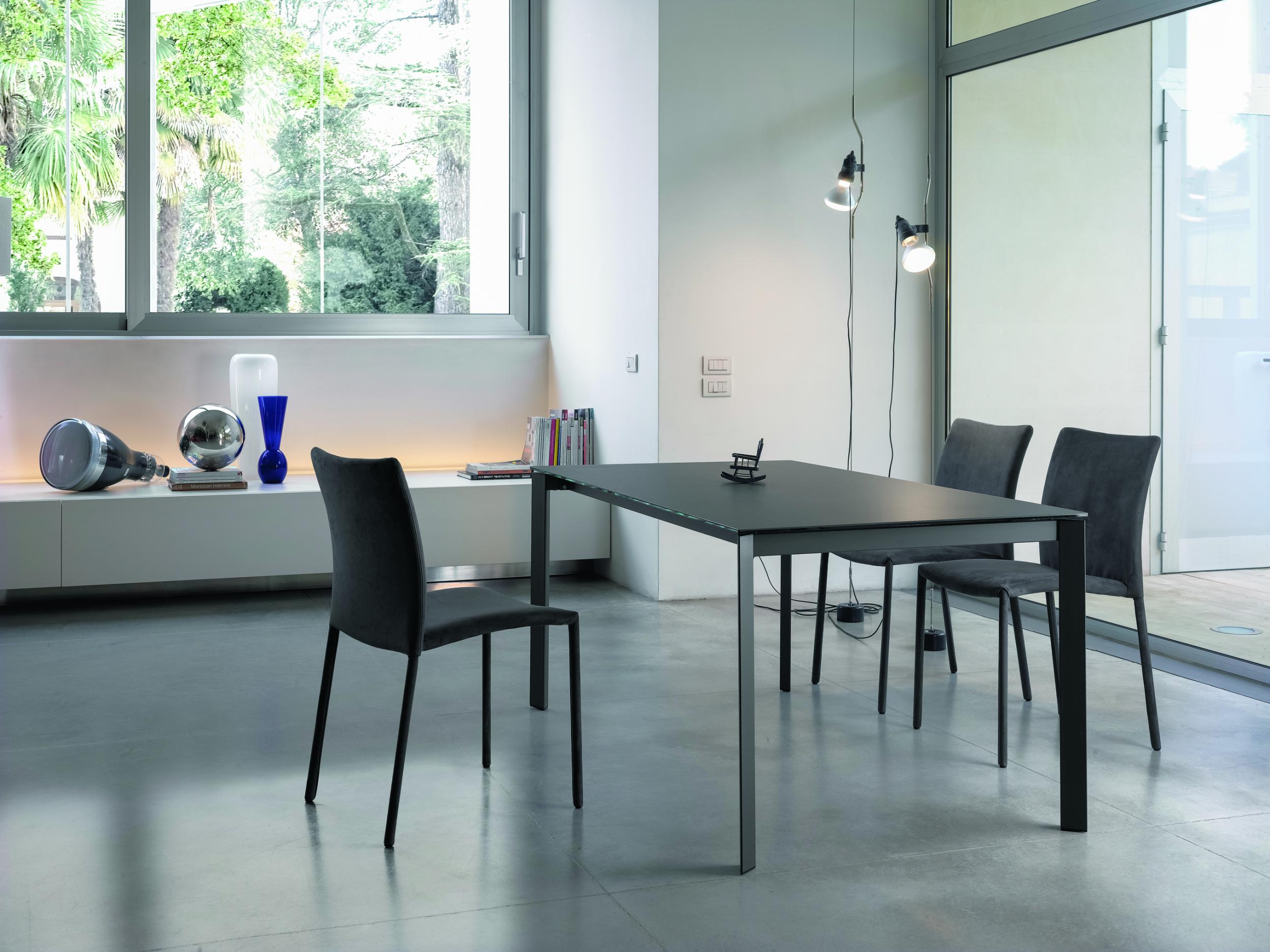 The Dublin extendable table   by Bontempi is a table with a modern and contemporary design combined with a wide range of sizes and finishes that make it suitable for being inserted in any living area and kitchen context. The top is available in: glass, melamine, superCeramic   and superMarble . The extensions of the Dublin table are in most cases made to match the top. For the glass, superCeramic and superMarble versions the extension is in matt lacquered wood. The structure is made of lacquered steel.