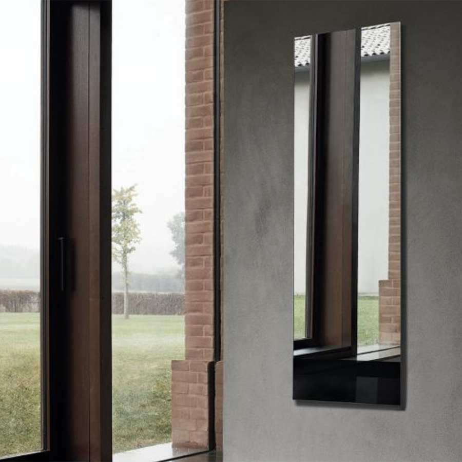 Eidos mirror by Bontempi. Vertical mirror with band in glossy black lacquered glass or white sandblasted glass.