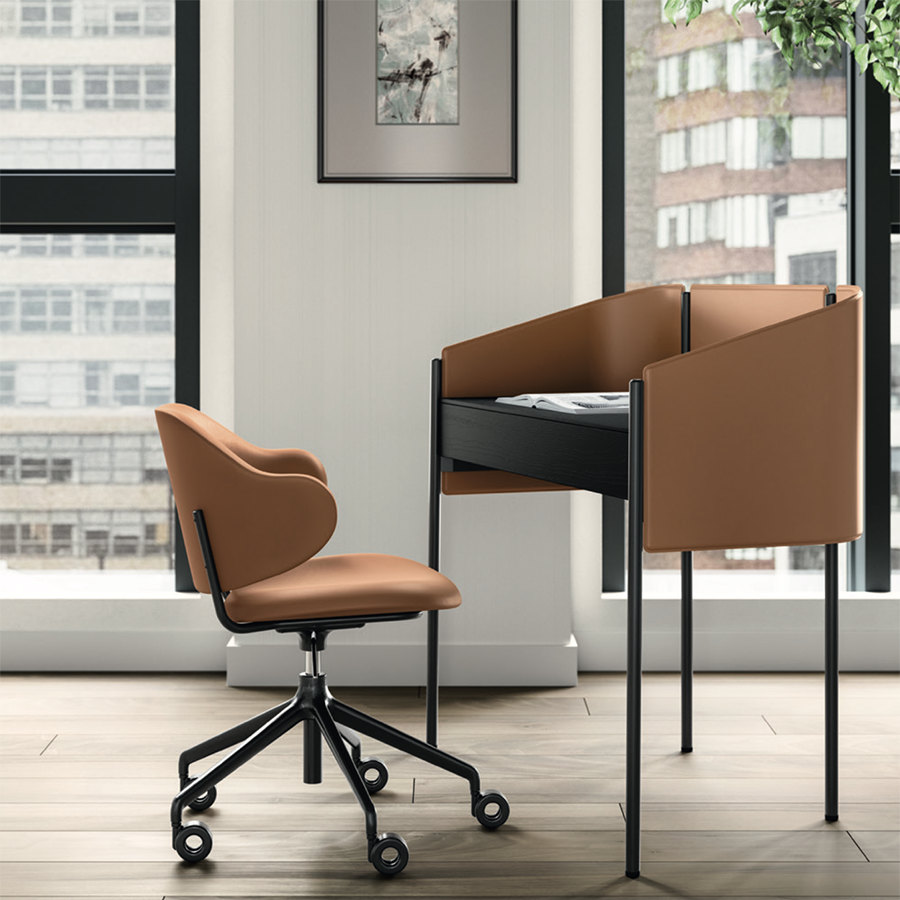 The HOLLY family is inspired by the design of the "50s": this chair stands out with its enveloping, padded and generously sized backrest which gives the possibility of resting the arms comfortably. Extremely welcoming and comfortable, designed with soft and simple lines, it adds the functionality of the study chair to elegance and comfort