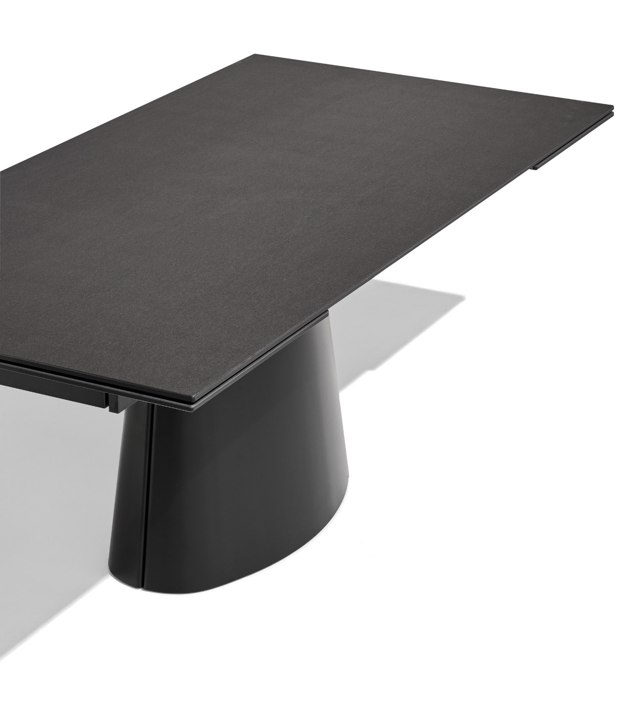Ellisse extendable table by Connubia with ceramic top on glass and both base and case in metal. Ellisse is available in two sizes with two lateral extensions that can be opened individually. It is an extendable table with a semi-automatic mechanism; the extensions are easily positioned by moving on special guides.