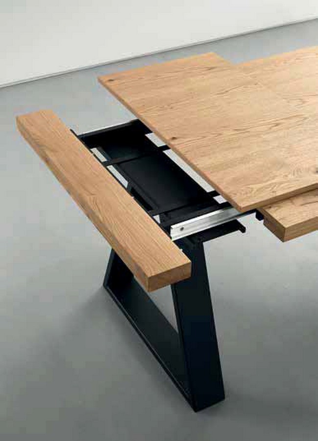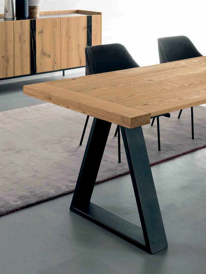 Mekano extendable table by Altacorte with black metal legs. Extendable table with Fast system. 5 cm thick brushed top available in various finishes. The Fast opening system allows the extension of the table with 2 steps and the containment of the extensions.