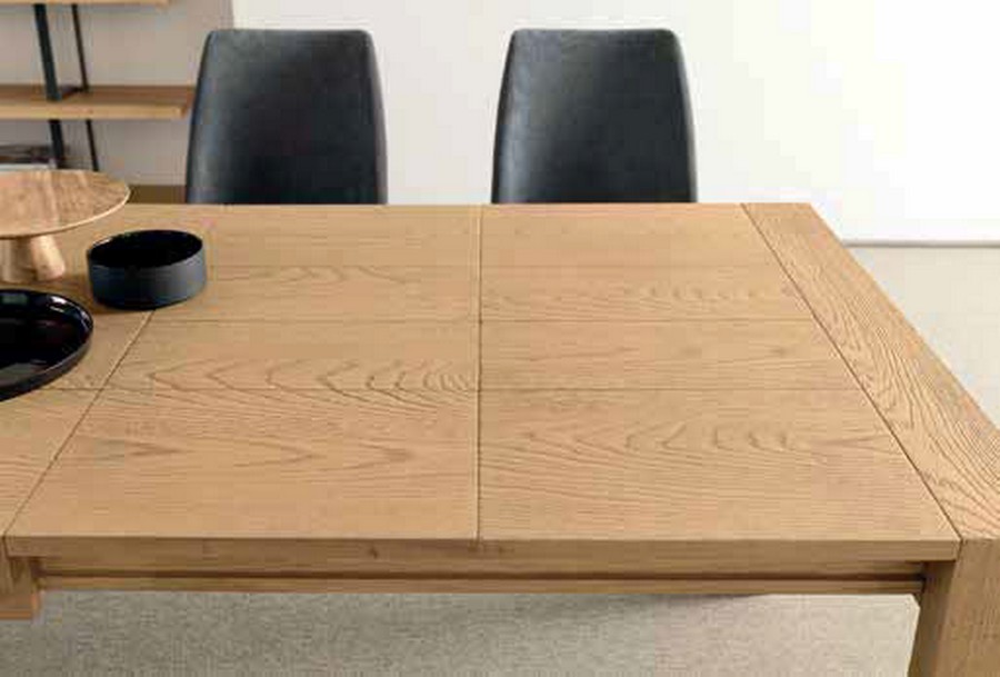 Montreal extendable table by Altacorte entirely in solid wood, extendable in 2 steps of 45 cm with booklet system contained in the table. Available in oak in various finishes. Brushed top.