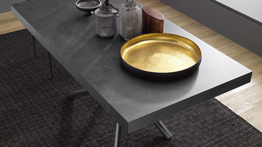 Fahrenheit dining table by Altacom. Extendable table, metal frame, top in melamine, wood or mortar effect. Synchronized opening with two internal extensions. Available in multiple sizes.