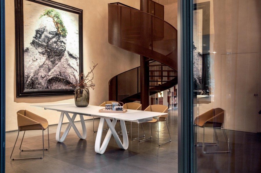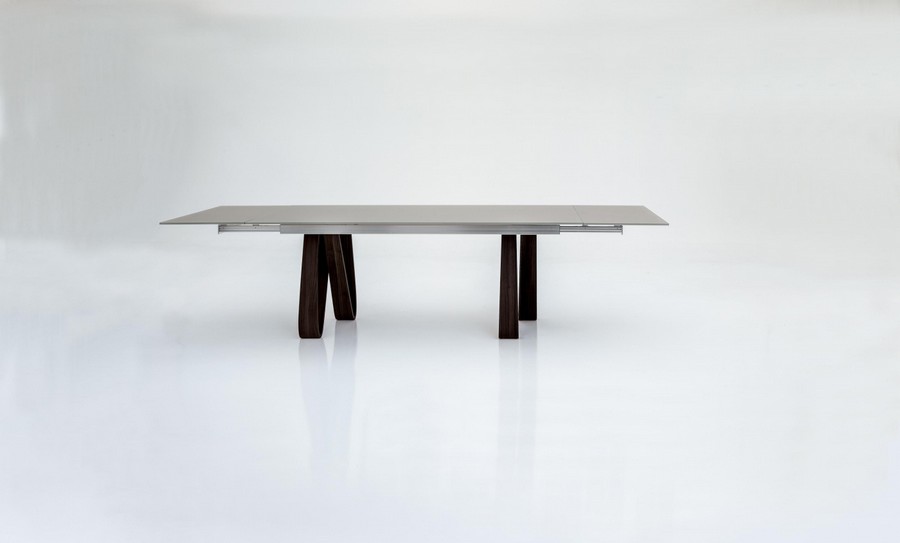 Butterfly fixed or extendable table by Tonin casa with glass, wood, marble, stoneware or ceramic top. The legs are made of thermo-curved plywood that combine a delicate design with the solid sweetness of the curved wood. Just like butterflies, even for this table the colors change almost infinite. You can transform your rooms with the grace of a butterfly. Extendable table with aluminum rail. The bold design of the base blends with the classicism of glass to rediscover an inimitable design table.