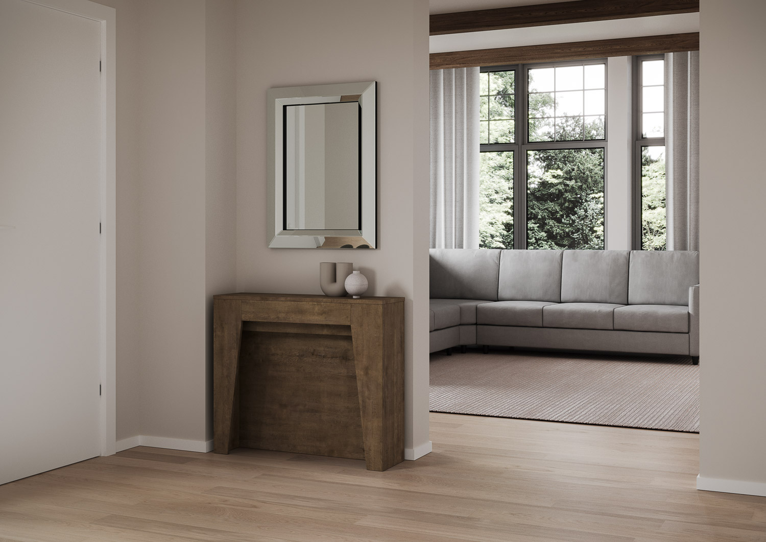 Anea extendable console, versatile and sturdy, a perfect complement for any room in the house: entrance, kitchen, dining room, living room or hallway. The Kiba extendable console can be easily transformed into a large dining table up to 211 cm long, able to accommodate 10 people. Made with melamine panels. The extension system with telescopic aluminum guides and the central support supplied make the console stable and sturdy. Once the console is closed, the 62x86 cm extensions find space inside the console structure. Itamoby product Made in Italy Dimensions: Closed console: L.90 D.25 H.77 cm Length with 1 extension: 87 cm Length with 2 extensions: 149 cm Length with 3 extensions: 211 cm