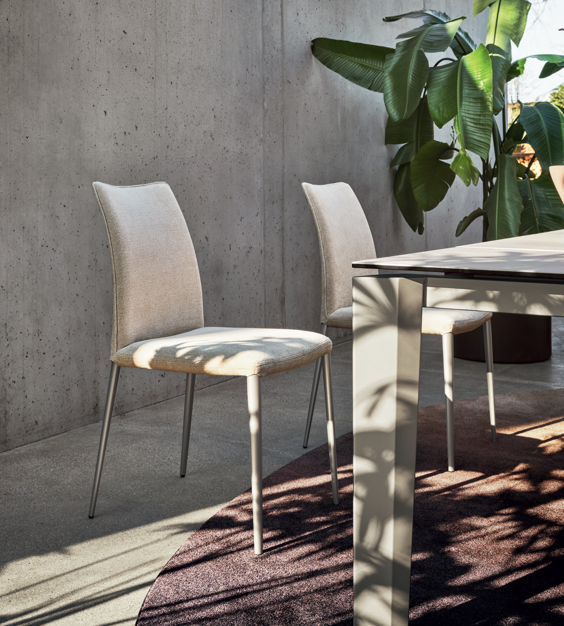 Dynamic lines, a flexible backrest, and a seat with elastic springs: Fay is a dining chair that accommodates even the most relaxed position. The tapered metal legs streamline its silhouette, making it an elegant addition to larger tables.