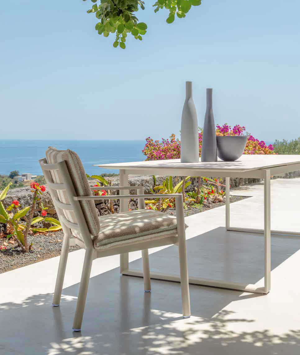 The Dining Armchair combines visual lightness and contemporary comfort in a simple yet refined design. The painted aluminum frame houses a padded seat and backrest, upholstered in technical fabric to ensure durability and easy maintenance, even in outdoor settings. The geometric lines and slender armrests create an elegant and harmonious shape, perfect for complementing dining tables on terraces, verandas, and contract spaces with a sober and timeless style.