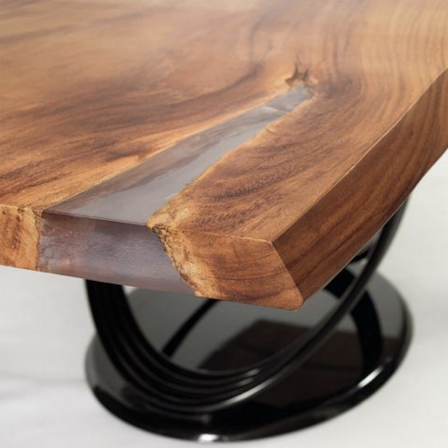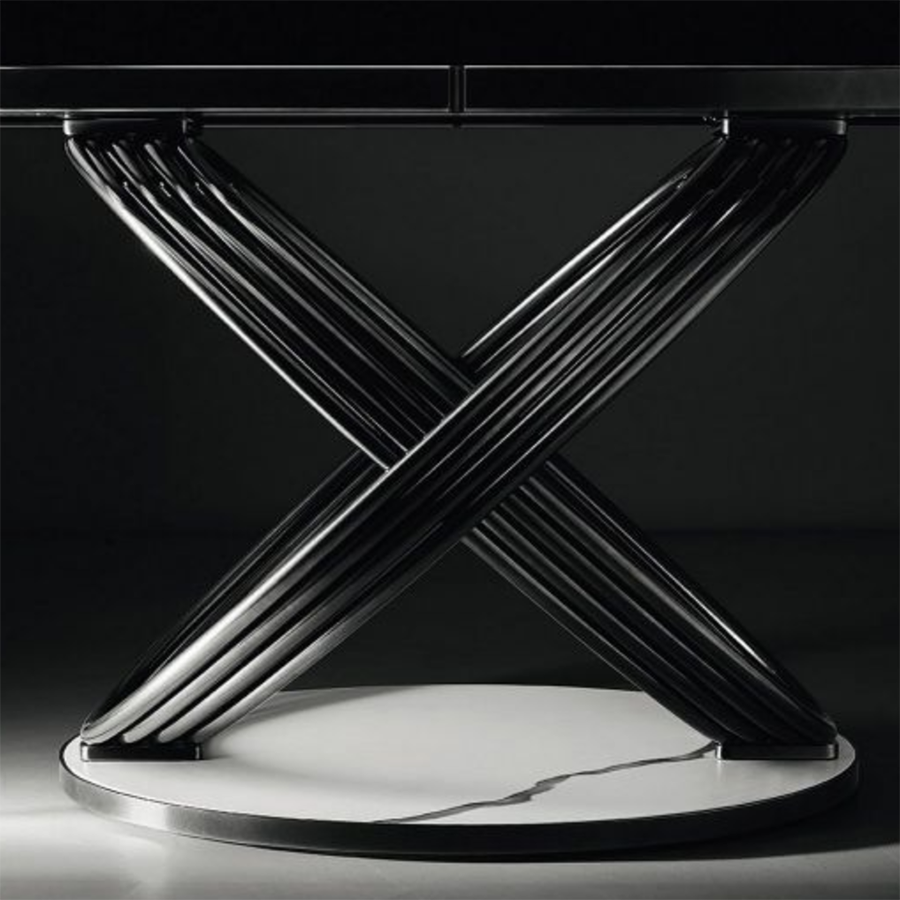 Fixed or extendable table with a lacquered steel ring frame. Base in lacquered steel, wood veneer, or SuperMarble. Top available in a variety of materials and finishes.