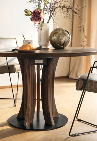 Fixed round Luna table by Altacorte with top and structure in oak or walnut, while the base (plate) is in steel. The Luna table is inspired by the phases of the moon through the curvature of the legs. The light passing through the shapes of the wood creates ever-changing plays of shadow.